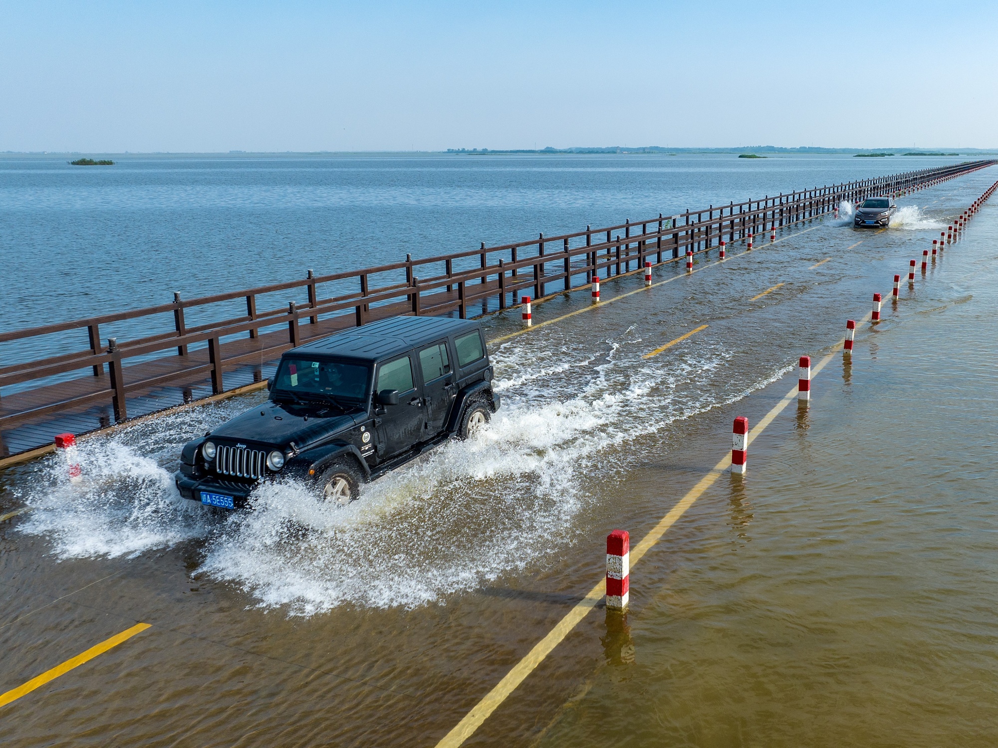 汽车在6月6日降雨后沿着鄱阳湖岸边的被淹没的道路行驶。
