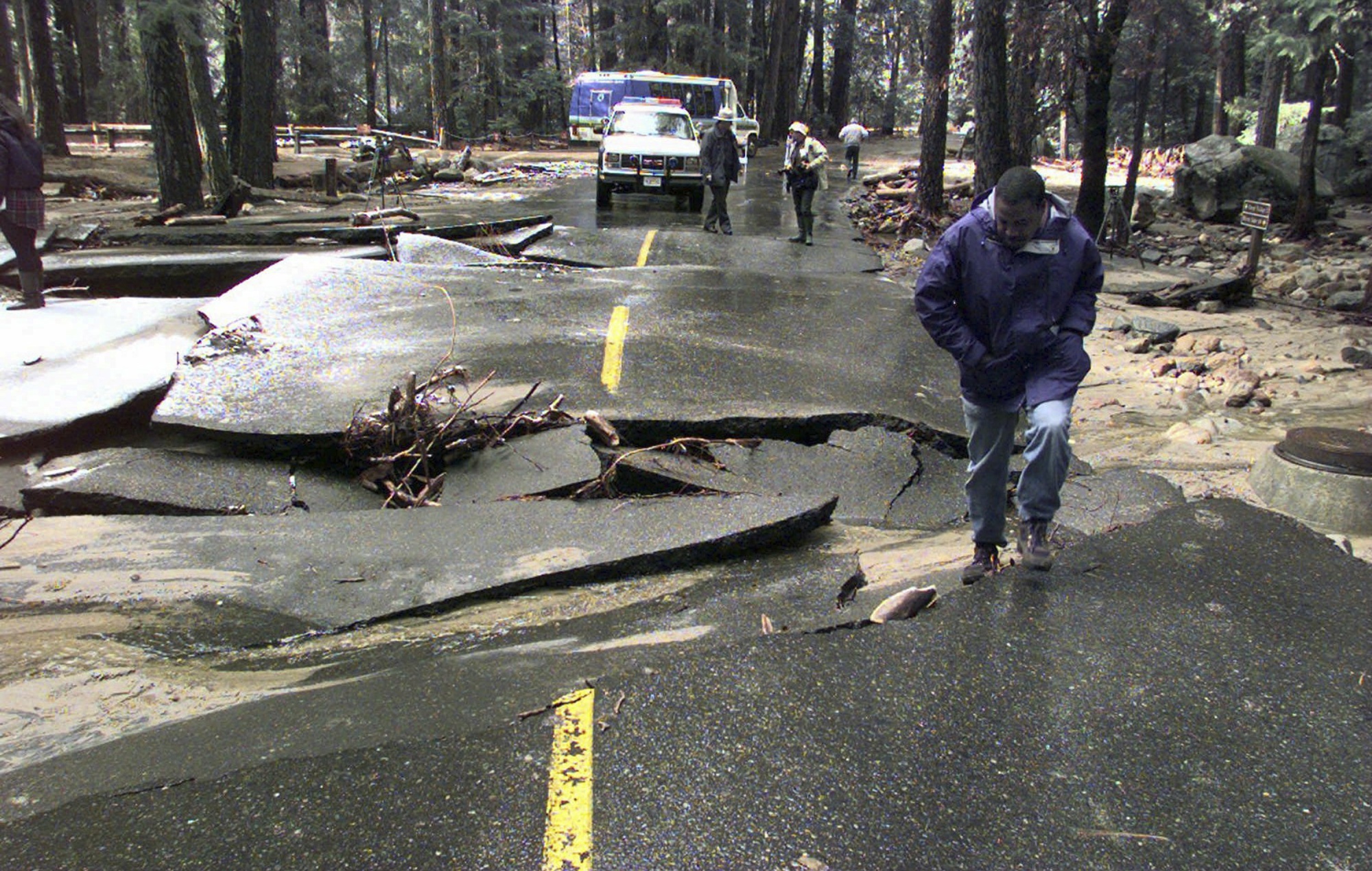 加利福尼亚州优胜美地国家公园Happy Isles自然中心附近的一段被冲毁的道路,1997年。