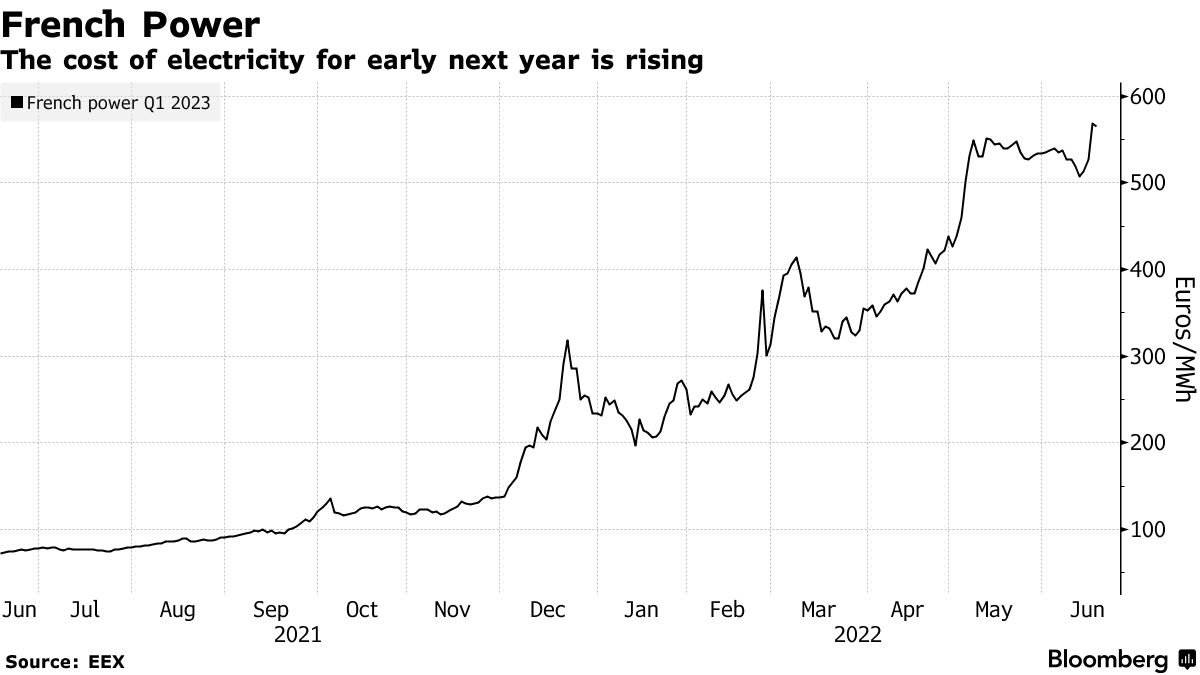 法国的电价正在飙升*,增加了欧洲的能源困境,因为受抑制的核能产量挤压了市场。根据我们编制的数据,法国的反应堆运行容量不到一半,上周的发电量是自2008年以来同期最低。该国正在从英国等邻国进口电力,而英国历来一直在购买法国的电力。*