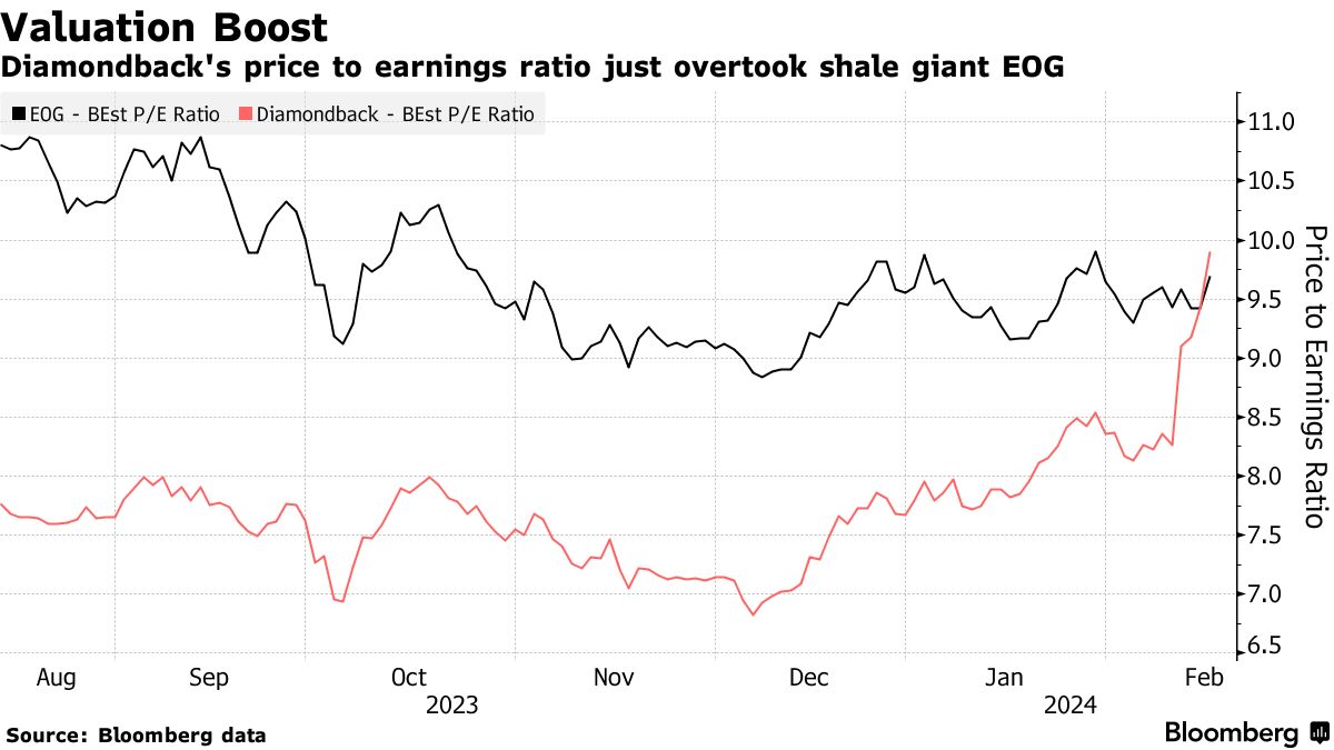在交易公告之后,钻石背的市盈率为9.9倍,超过了EOG,后者已承诺退出当前的购买狂潮。钻石背的市值将跃升到标普500指数的第150位,从今天的第275位,使其成为寻求更多暴露于跨越德克萨斯州和新墨西哥州边界的富产油田Permian盆地的大型投资者的关注焦点。