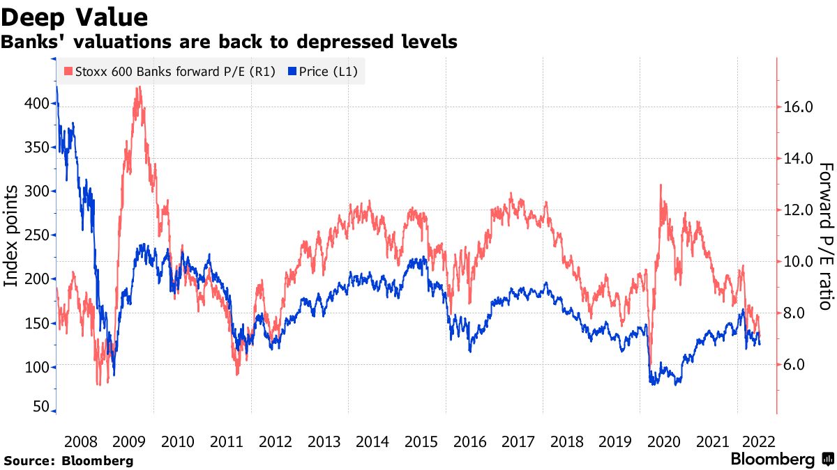 当经济衰退风险不断叠加时,欧洲银行可能是一个不太可能的选择,但贝莱德表示现在是向备受困扰的行业增加敞口的正确时机。“这是有争议的,但我认为欧洲银行存在极端的估值机会,”贝莱德基本权益联席首席投资官尼格尔·博尔顿告诉我们。“不断上升的利率正在提高净利差。银行仍然非常便宜,并且有强劲的收入支撑,尤其是受益于零售的银行。” 随着央行转向鹰派以遏制通胀,放贷人已成为衰退担忧的代表。