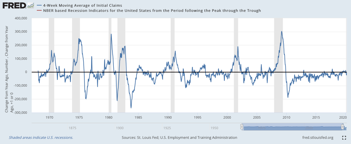 以失业保险索赔为例。通常当一个人失去工作时,失去的部分收入可以通过失业保险来减轻。在像美国这样的大经济体中,总会有一些变动。因此,每周总会有一些最初的失业索赔。