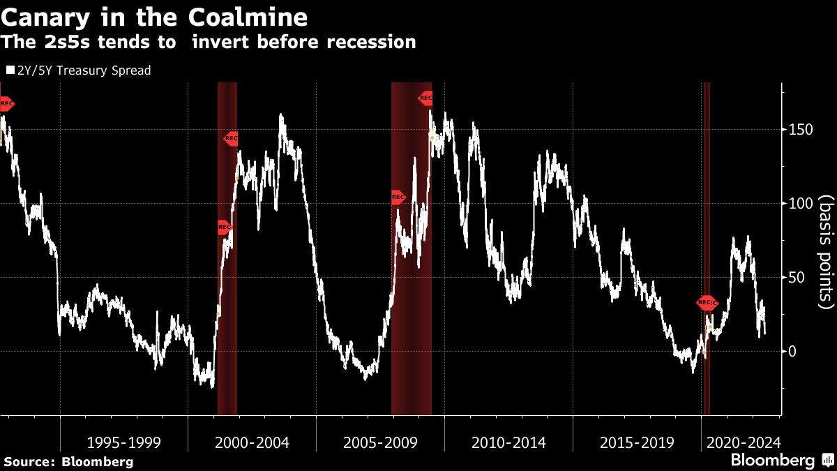 如果你想在衰退之前做好准备,就需要知道衰退的可能性有多大。在市场数据方面,我所谓的“真实晴雨表”是两年期和五年期国债收益率之间的利差。这是因为两年期包含了所有近期的联邦基准利率上调,而五年期则包含了此后政策的变化。如果由于衰退的原因,美联储被迫开始大幅降息,这个利差应该是负值。在过去的三次衰退中,它确实是负值。