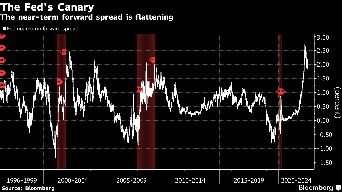 目前,五年期收益率比两年期收益率高约20个基点。美联储喜欢另一种衡量方式,称为近期前瞻利差。这衡量的是3个月期国债与市场预期的18个月后3个月期国债的利差。这应该充分反映市场对收紧政策的预期,如果这个利差变为负值,市场就在告诉你经济状况非常糟糕,美联储将很快开始降息。
