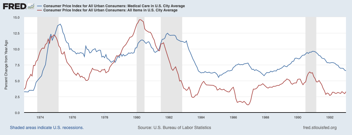 在早期通货膨胀时期,医疗价格上涨滞后,但随后保持较高水平更长时间。但是,即使总体通货膨胀趋于稳定,医疗保健价格多年累积的增长仍然产生了持久影响:面对持续上涨的医疗保健价格,雇主和政府寻求控制成本。结果产生了像托管护理健康计划和高免赔额政策这样的新保险产品,这些产品帮助塑造了今天的医疗保健行业。部分是为了应对高昂的医疗价格,美国制定了复杂的管理系统,旨在避免浪费的医疗保健。(这些系统本身可能会增加成本。)
