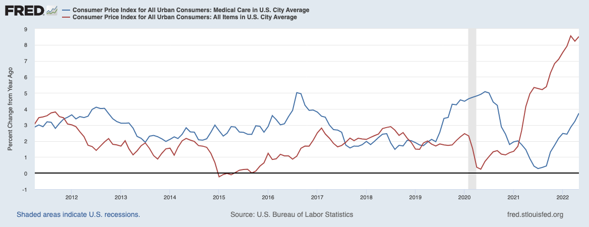 美国的通货膨胀正在激增,价格上涨速度为40年来最快,美联储正在加息以抑制通货膨胀。在正常情况下,医疗保健的价格涨幅超过整体通货膨胀。奇怪的是,现在并非如此:医疗价格落后于整体通货膨胀,而不像通常那样领先。
