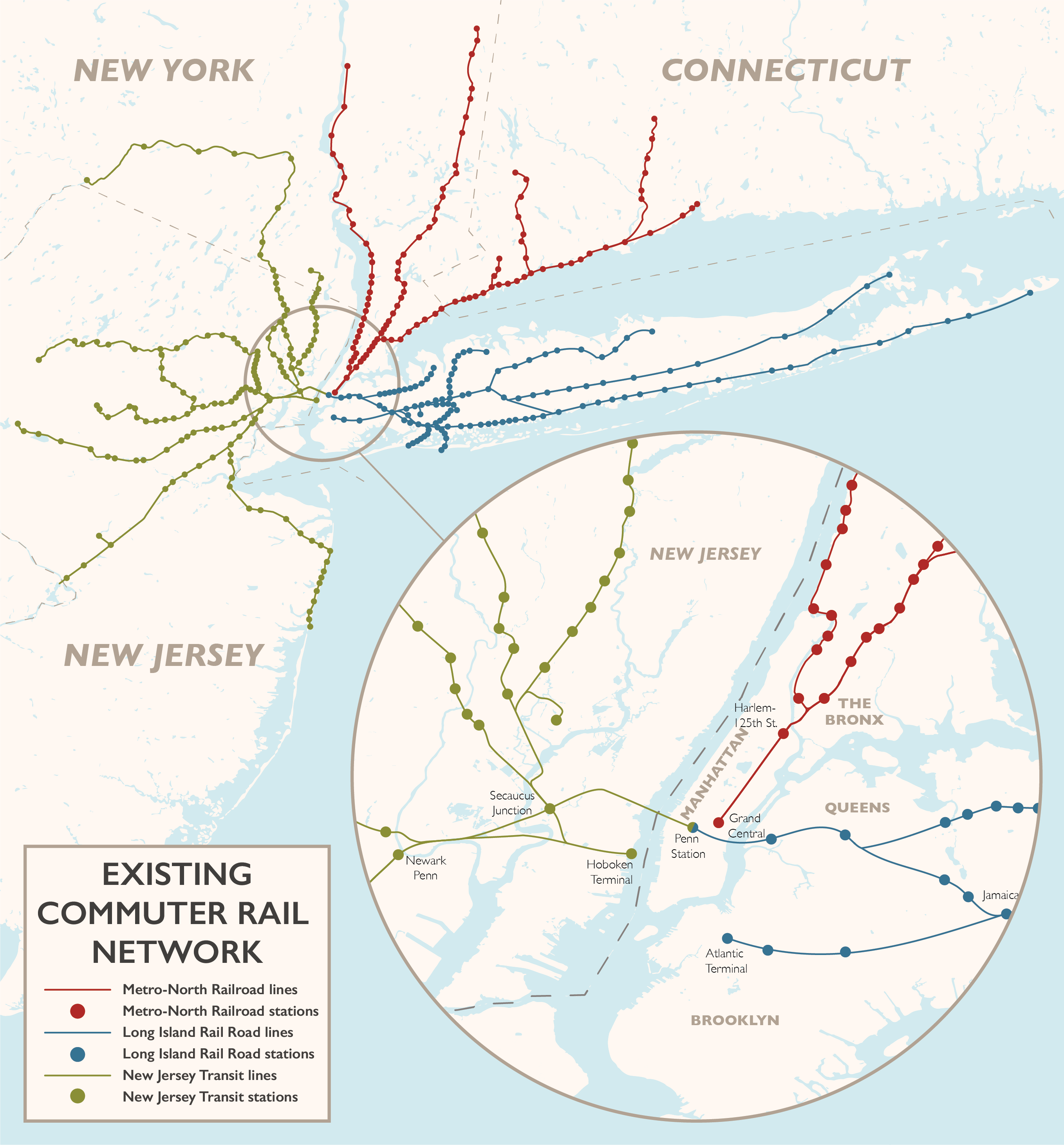 如果拟议的区域铁路网络成为现实,乘客将逐渐习惯于在纽约宾夕法尼亚车站穿梭的高频地铁式服务 —— 这是该市的关键交通枢纽之一,目前连接着Amtrak客运、NJ Transit、长岛铁路通勤铁路和纽约地铁。(地铁式服务可以通过在城市内至少每15分钟一班火车,郊区至少每半小时一班火车来实现。)