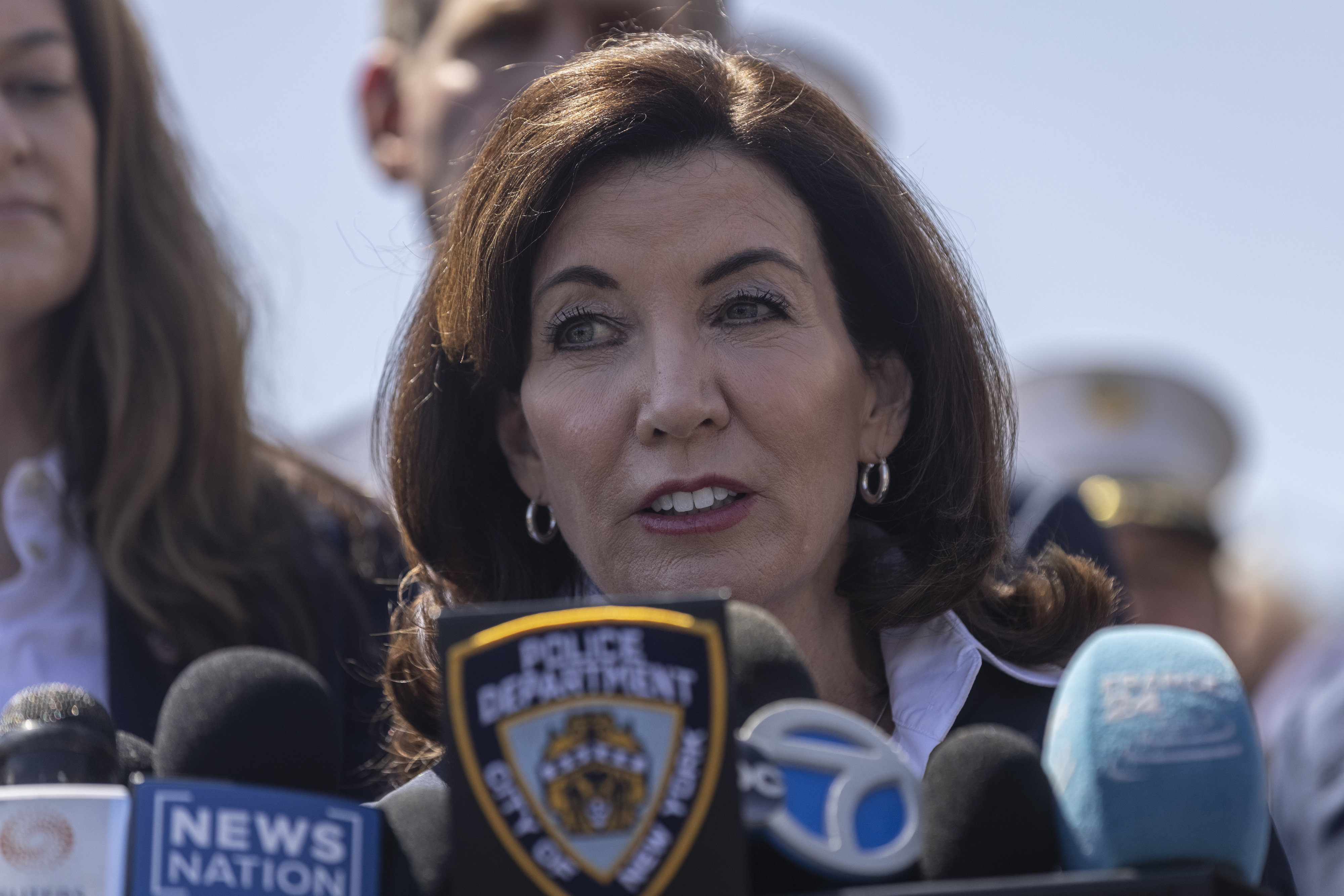 纽约州州长凯西·霍库尔在一名男子在地铁车厢内射击了十多人后举行新闻发布会。
