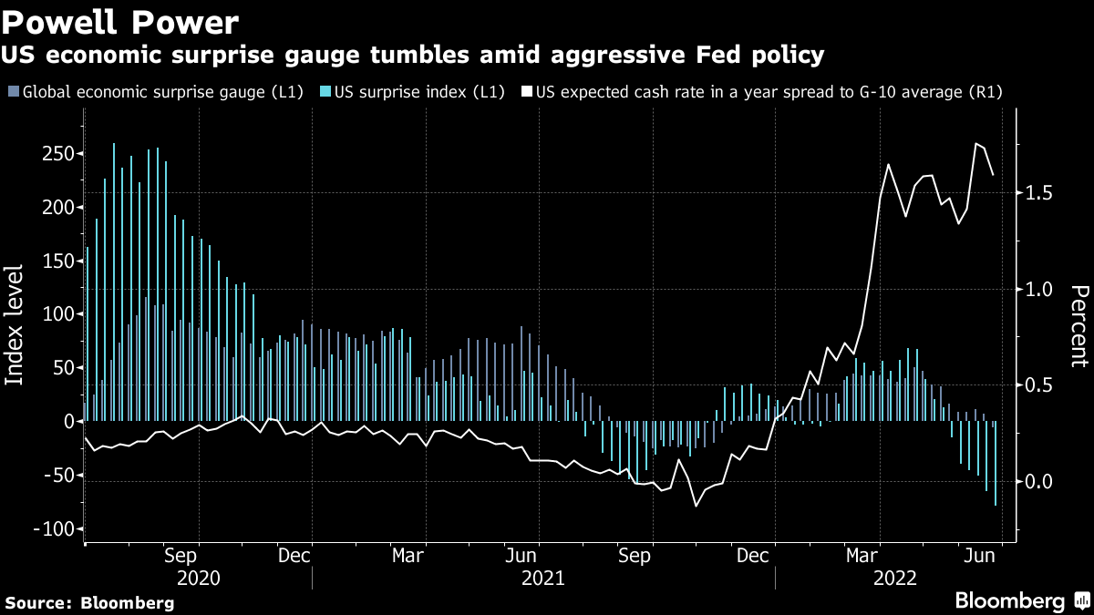 数据也证实了这一点,花旗集团的美国惊喜指数急剧下滑,跌入负值领域,比全球指数下降得更为陡峭和深远。尽管主席杰罗姆·鲍威尔公开表示经济仍然强劲,但美联储的展望比发达市场平均水平更为激进,显然产生了强烈影响。