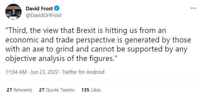 现在保守派开始喊“恐惧工程”,并抨击那些看法悲观的城市人。与欧盟谈判英国贸易协议的人,大卫·弗罗斯特,今天早上发推表示。