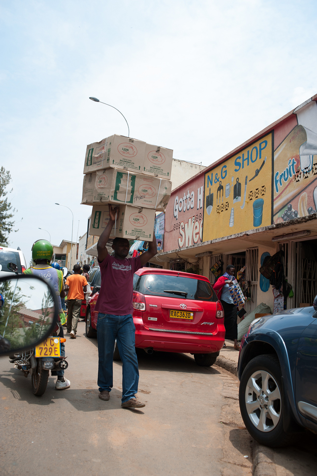 一个搬运工在卢旺达基加利头顶扛着箱子。