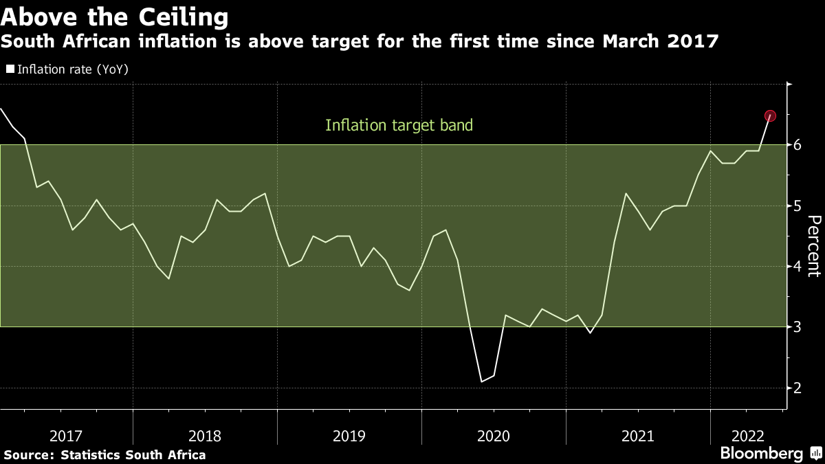 - 南非5月份的年通胀率从上个月的5.9%加速至6.5%,首次超过中央银行的目标范围超过五年。这引发了政策制定者可能会在近20年来以最大幅度提高借贷成本的可能性。