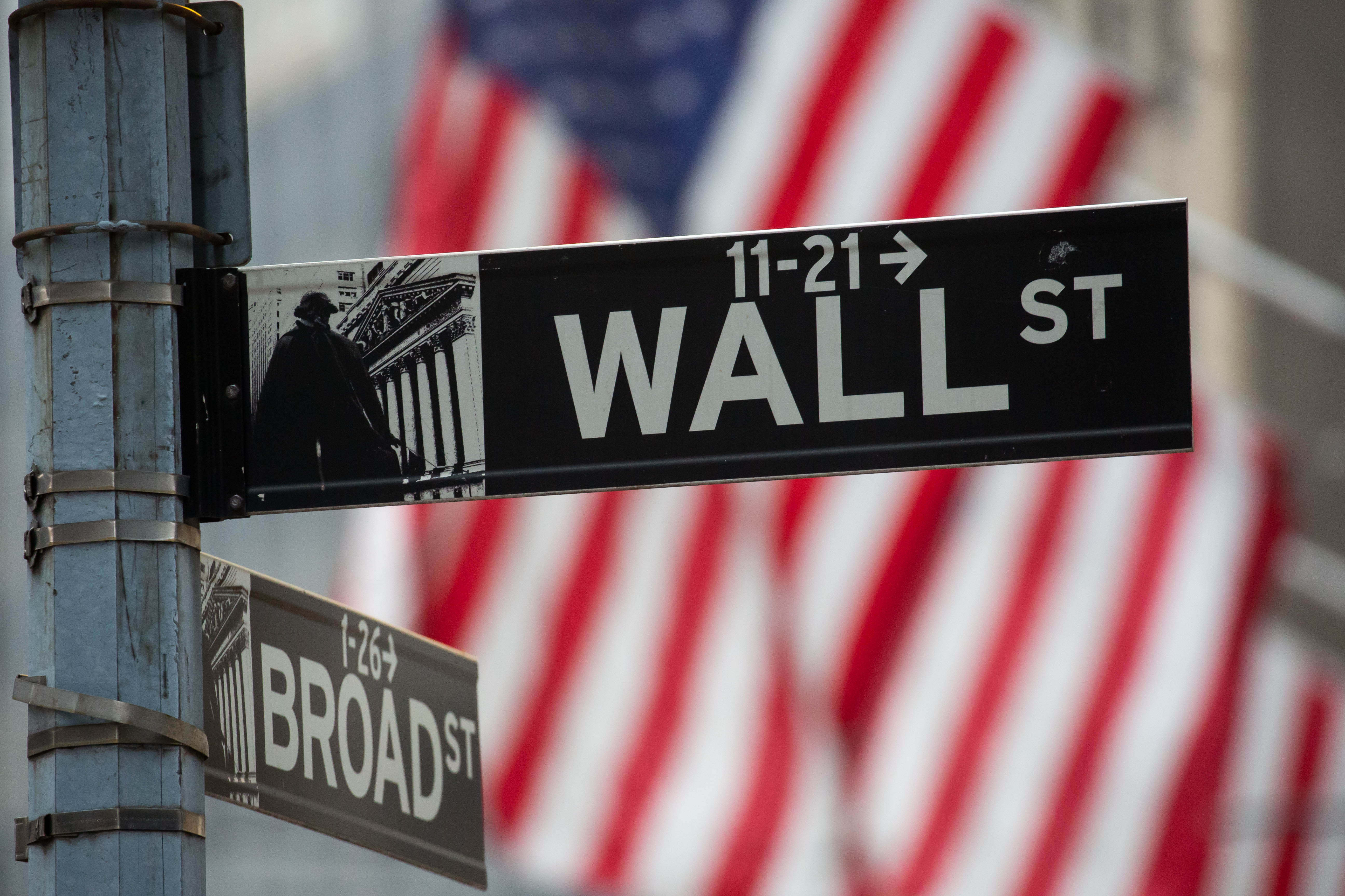 纽约证券交易所(NYSE)前的华尔街街道标志,美国纽约。