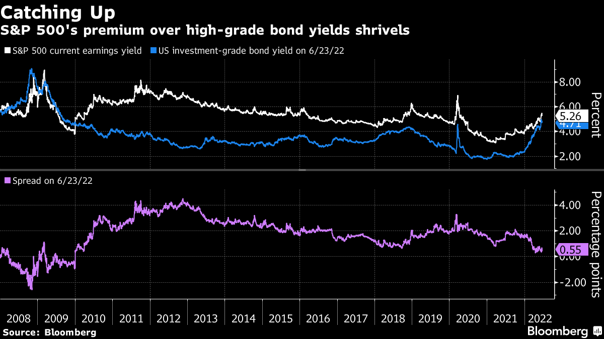 应用于公司债券的联邦储备模型的一个版本很好地说明了这一点。目前标普500指数的盈利收益率约为5.3%,仅比美国投资级平均收益率4.7%高出55个基点。这接近自2010年以来的最窄差距。