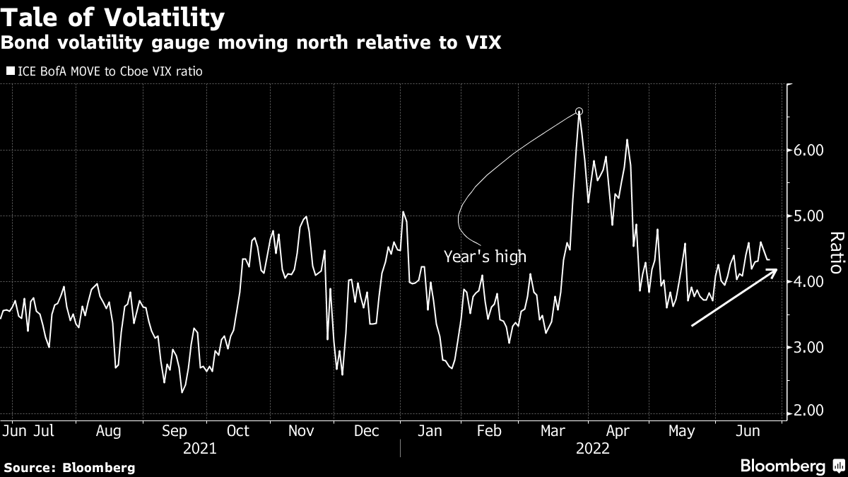 尽管股票和债券在过去几个月基本上一直在同时抛售,但这两类资产之间的波动性差距正在扩大。尽管股票在一天内剧烈波动,但CBOE波动率指数一直在一个相当平静的范围内波动,周三VIX指数跌破29。与此同时,国债波动率的MOVE指数上周达到了自2020年以来的最高水平。