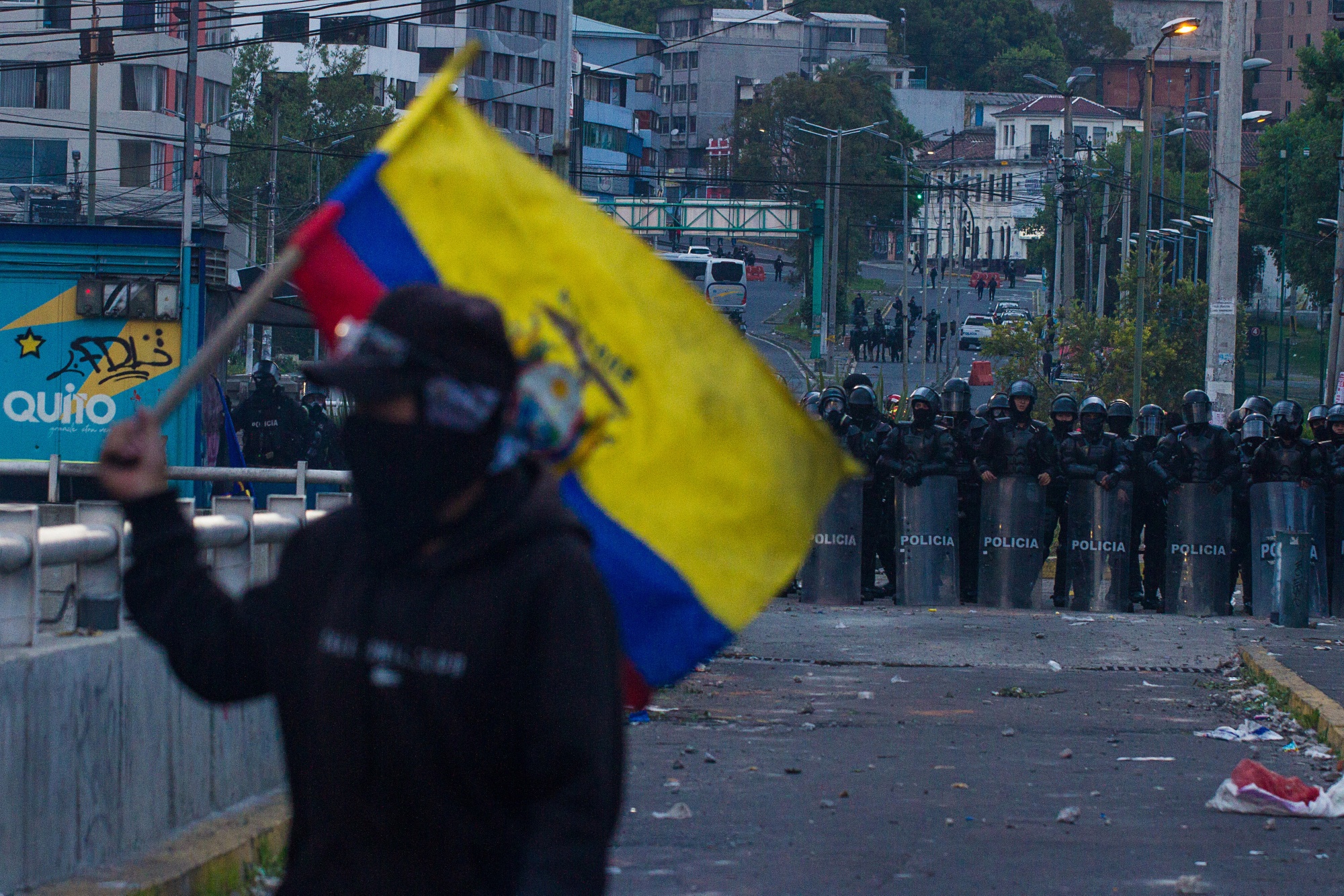 示威者在2022年6月22日在厄瓜多尔基多举行的土著土地工人运动抗议活动中与警察对峙。