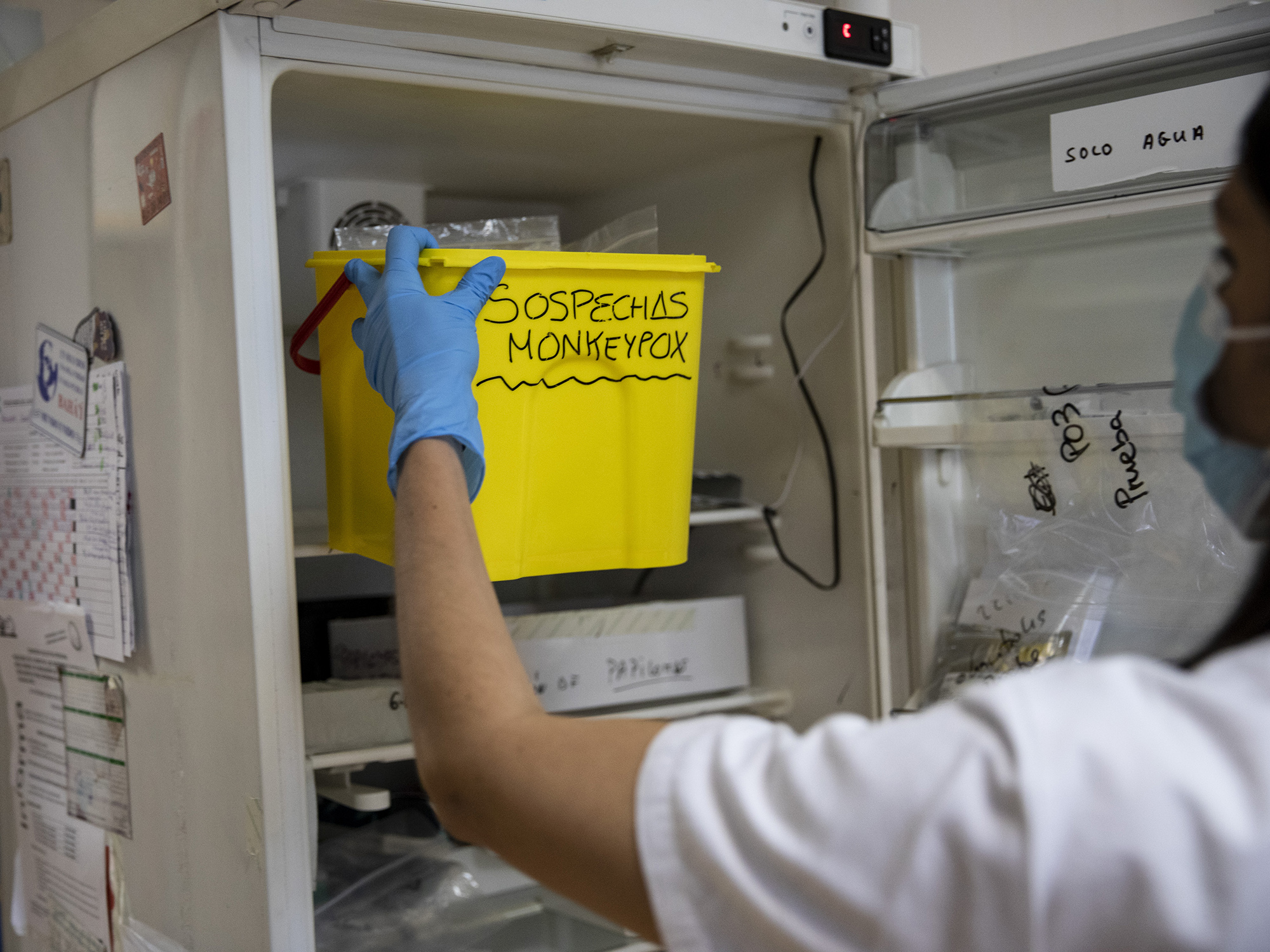 一名实验室技术员在马德里拉帕斯医院微生物学实验室中拿起疑似猴痘样本进行测试。