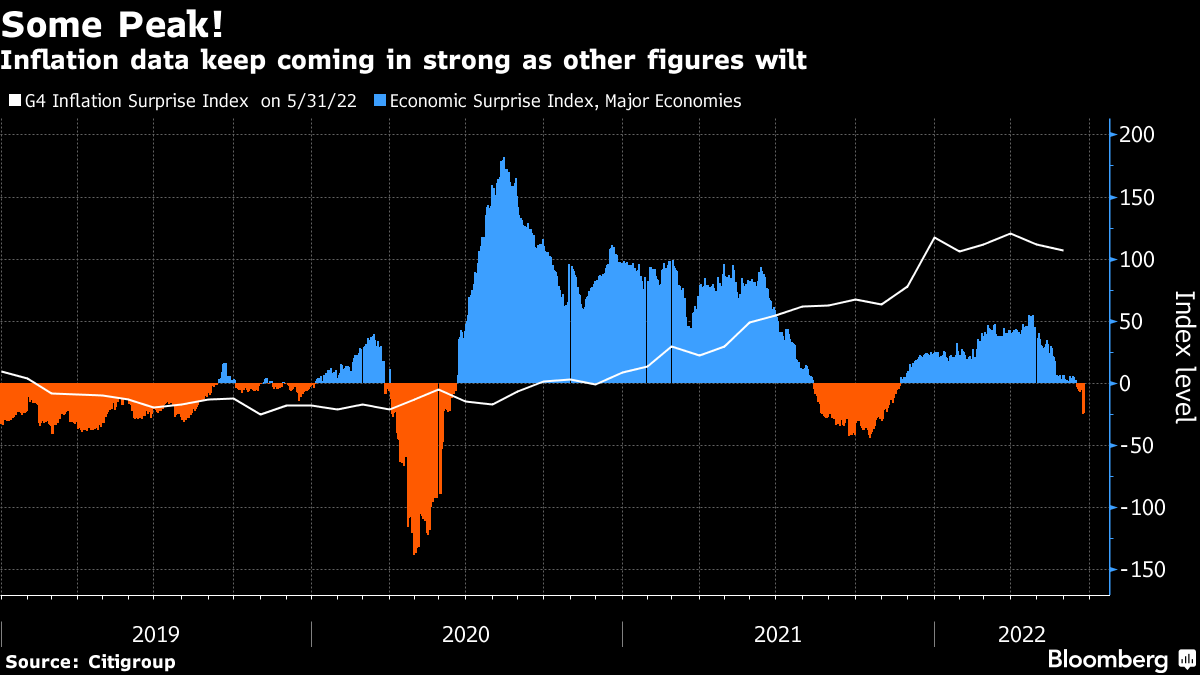 投资者的关键希望也许是通胀即将见顶,这一叙事在本月初曾短暂绽放,但在5月美国CPI数据公布后被打破。到目前为止,数据显示通胀数据是唯一明显超过预期的经济数据,其他数据则低于预期,随着利率上涨开始产生影响。除非数据脉冲图开始反转,否则股市不太可能长期保持最近的涨势。