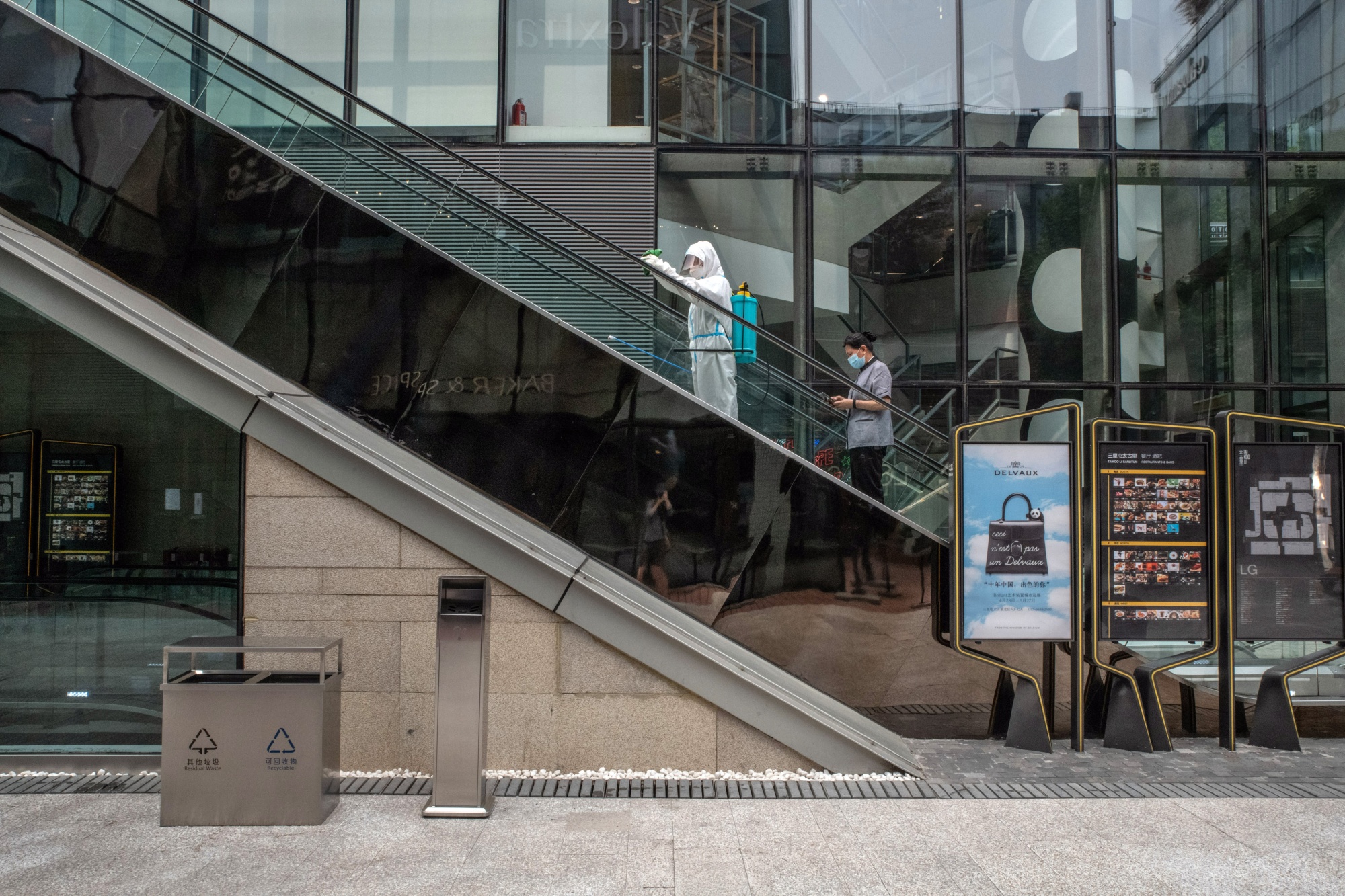 一名员工在2022年6月19日星期日在中国北京的一家购物中心消毒扶梯。