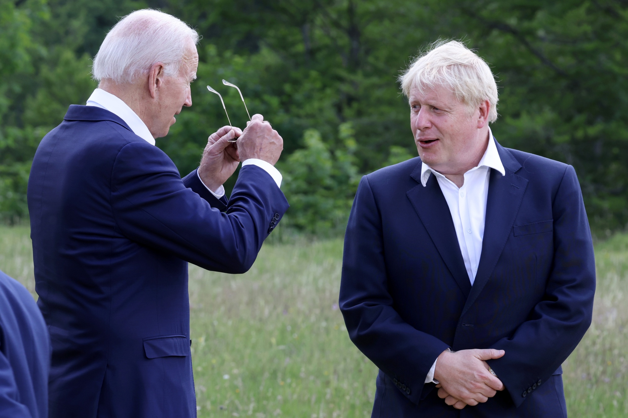 美国总统乔·拜登(左)和鲍里斯·约翰逊在周日G-7峰会开幕式上。摄影师:Liesa Johannssen-Koppitz/彭博社### 刚刚发生了什么