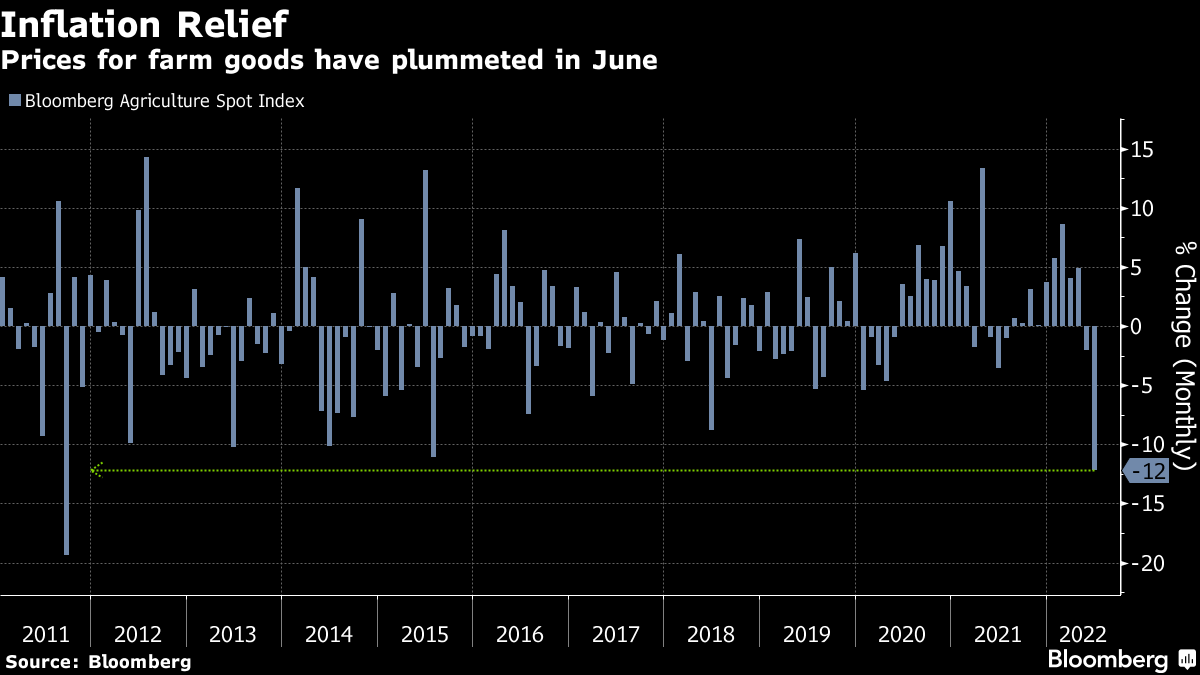 逃离食品通胀可能很快会被控制住 — 至少是暂时的 — 因为农产品价格下跌。俄罗斯入侵乌克兰四个月后,贸易流向被打乱,期货价格飙升,人们担心粮食短缺的恐慌正在被乐观情绪所取代,关键生产国将获得足够大丰收来帮助补充因战争而受损的储备。