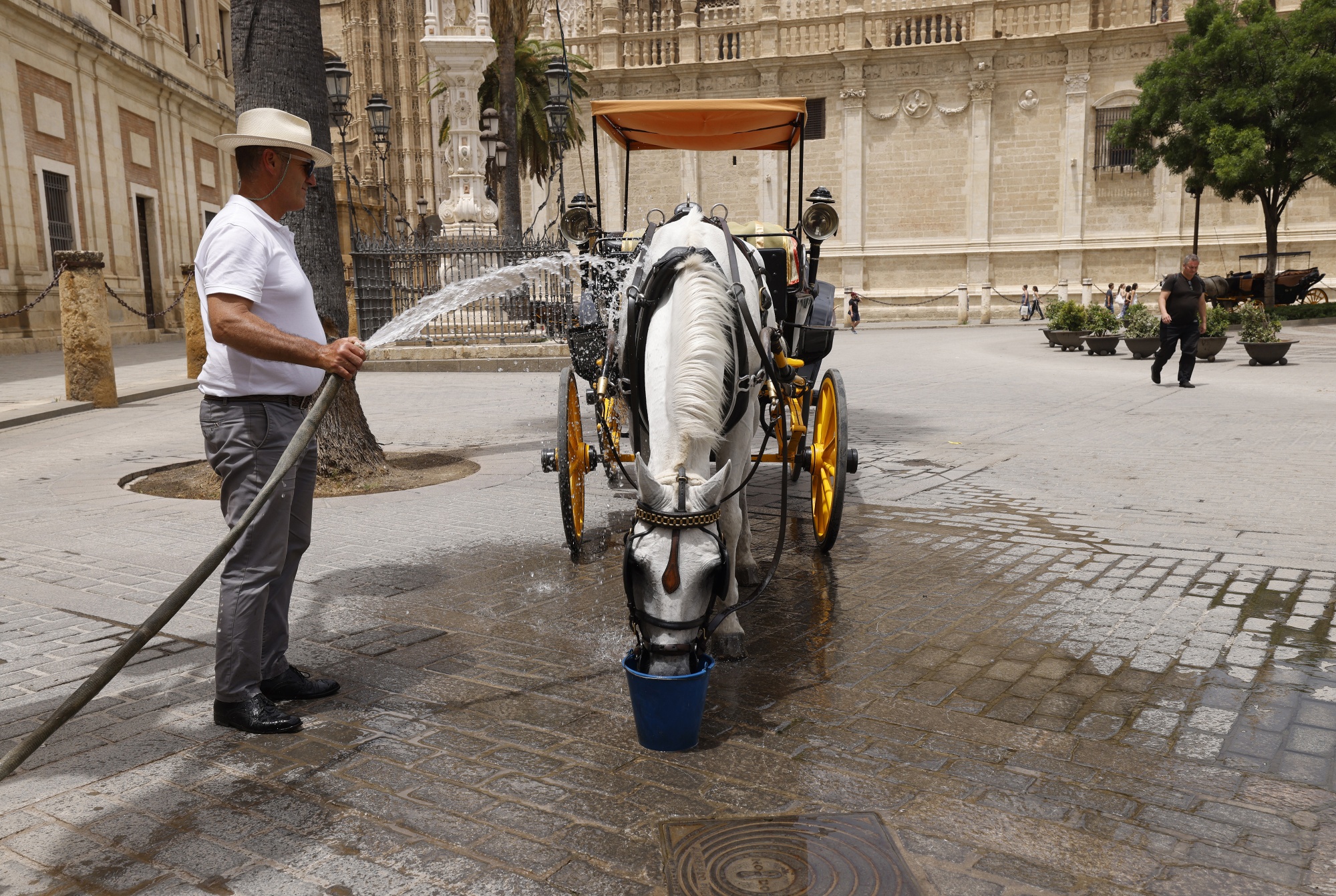 一名马车夫在西班牙塞维利亚的热浪中用水喷洒马匹以保持凉爽,日期为6月15日。