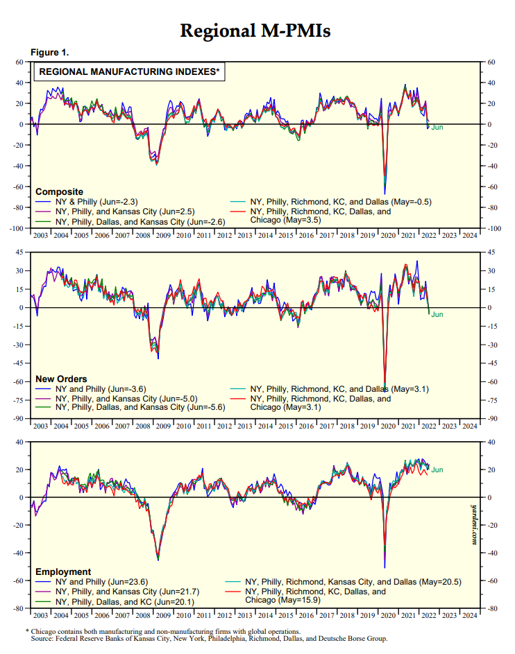 地区联邦储备银行指数是一个很好的起点,因为它们提供了对12个地区联邦储备银行地区经济状况的视角。在这方面,数据指向经济中出现了越来越多的软肋。事实上,最新的纽约、费城和达拉斯联邦储备银行制造业数据都是负数 — 意味着制造业正在收缩 这些地区。这些数字都在下降,就业仍然保持稳定,但也开始出现裂痕。