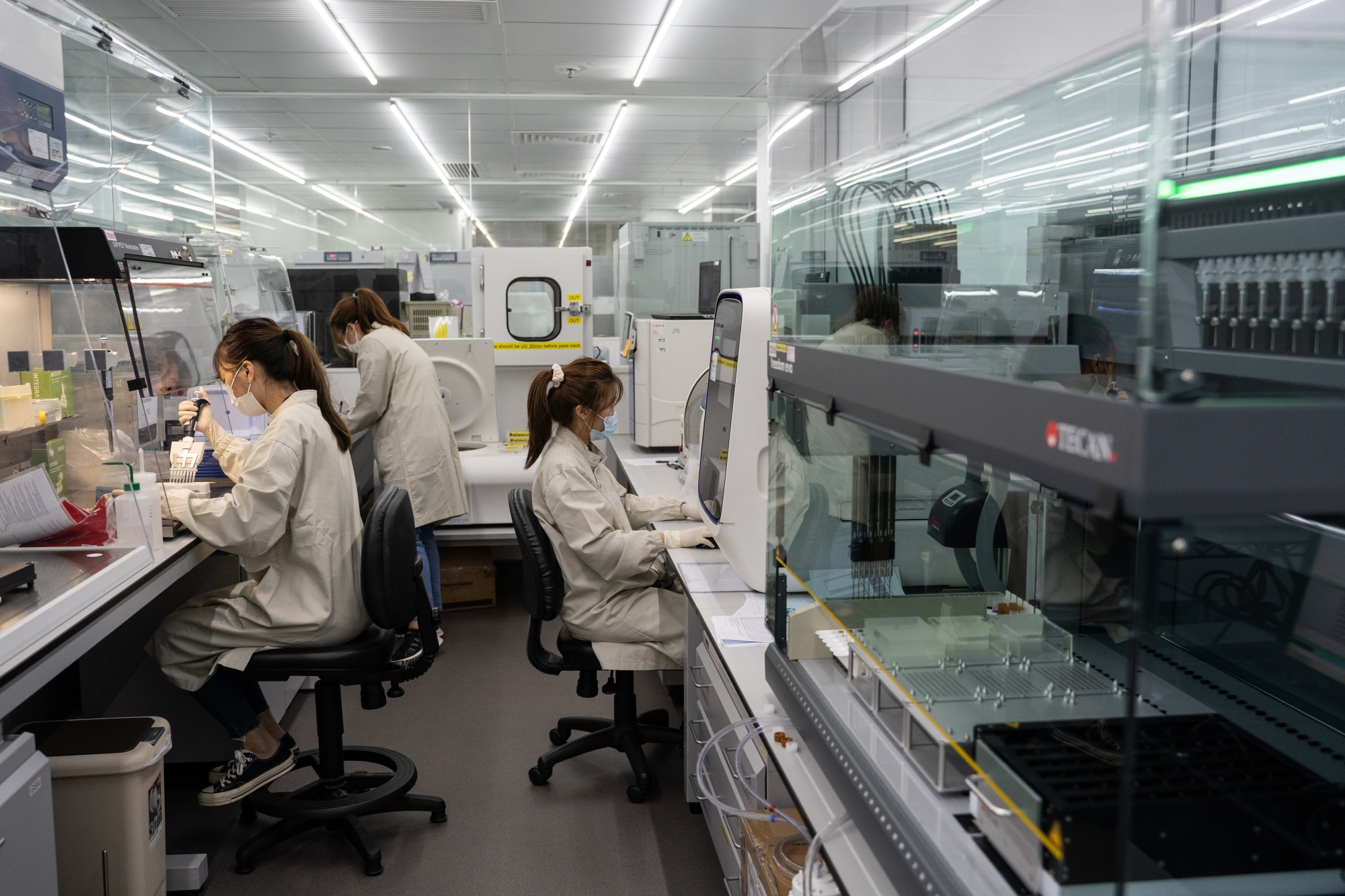 技术人员在香港的一家Prenetics实验室处理Covid-19测试。摄影师:Roy Liu/Bloomberg但香港未来的转型可能需要远远不止一个成功的上市来赶上新加坡。