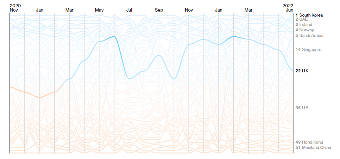 自2020年11月以来,彭博的Covid韧性排名一直在追踪疫情期间最好和最差的地方,使用一系列数据点来捕捉世界上最大经济体如何处理这一代健康危机的每月快照。