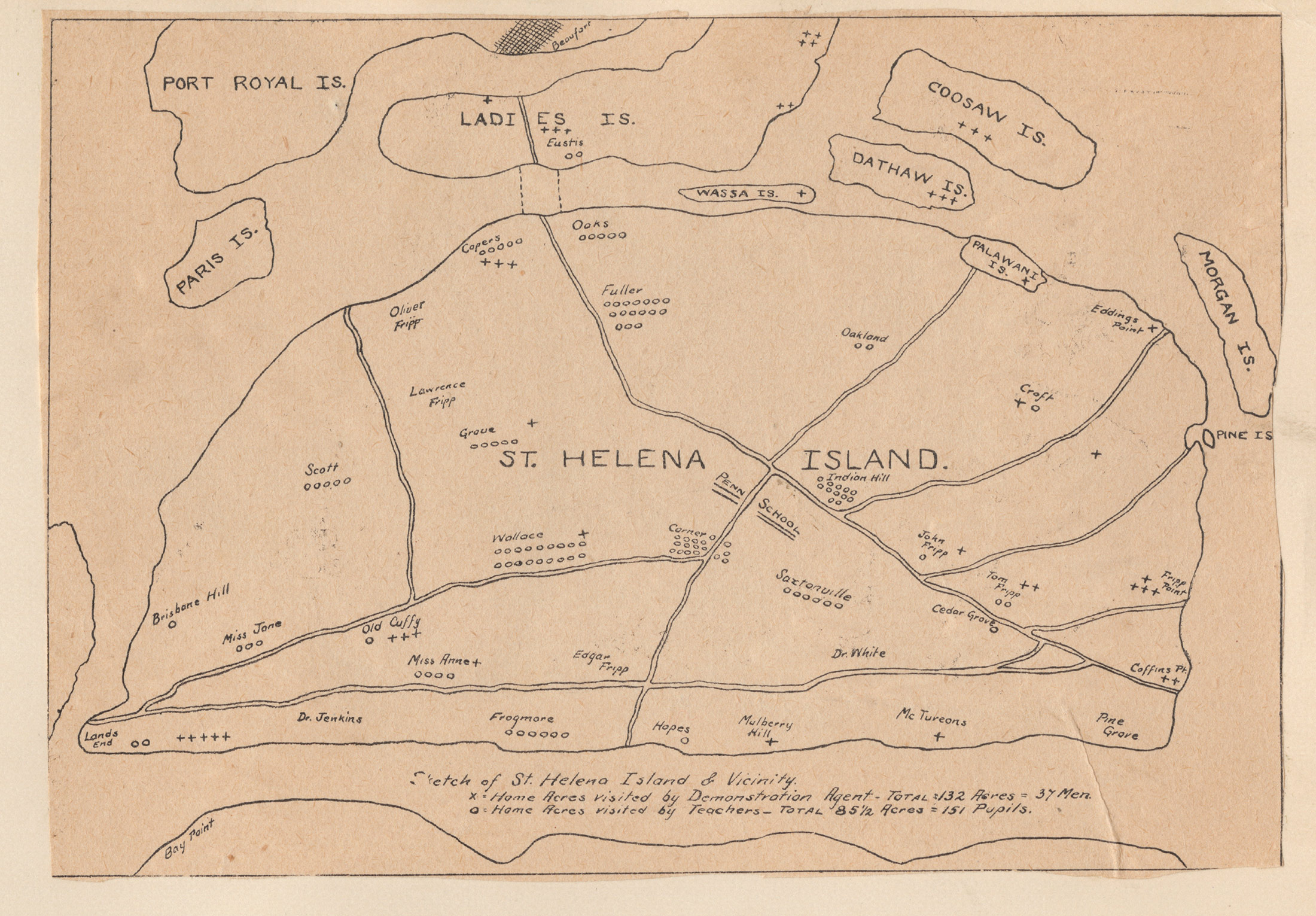 20世纪初圣海伦娜岛及周边海岛的地图。来源:来自宾夕法尼亚学校文件,北卡罗来纳大学教堂山分校威尔逊图书馆圣海伦娜岛在黑人历史中的地位是由与美国内战相关的两件事件铸就的。第一件事是1861年的大逃亡,当时博福特的整个白人人口——当时是海岛种植园主的避暑胜地,也是美国同规模中最富有的城市之一——在联邦军队到来之前一夜之间逃离。他们抛弃了豪宅、庄园,以及大约8,000至12,000名黑奴。当地传说称,北方士兵在博福特只找到一个白人男子,而且他喝醉了。军队支付了留下的黑人人口来耕种,使他们在事实上,尽管还不是在法律上自由。北方人赶到圣海伦娜岛提供帮助,建立学校和培训项目。消息传开。到1862年夏天,几乎有3,000名难民奴隶找到了这里。