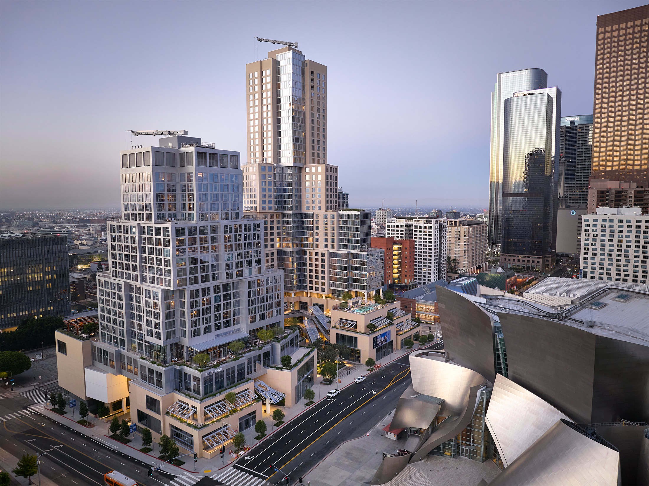 洛杉矶山顶开发项目的28层Conrad酒店将于7月6日开业,第一批租户将于7月15日搬入旁边的45层公寓大楼。零售部分——两座塔楼之间的类似购物中心的空间,用于餐厅和精品店——将于2023年首次亮相。