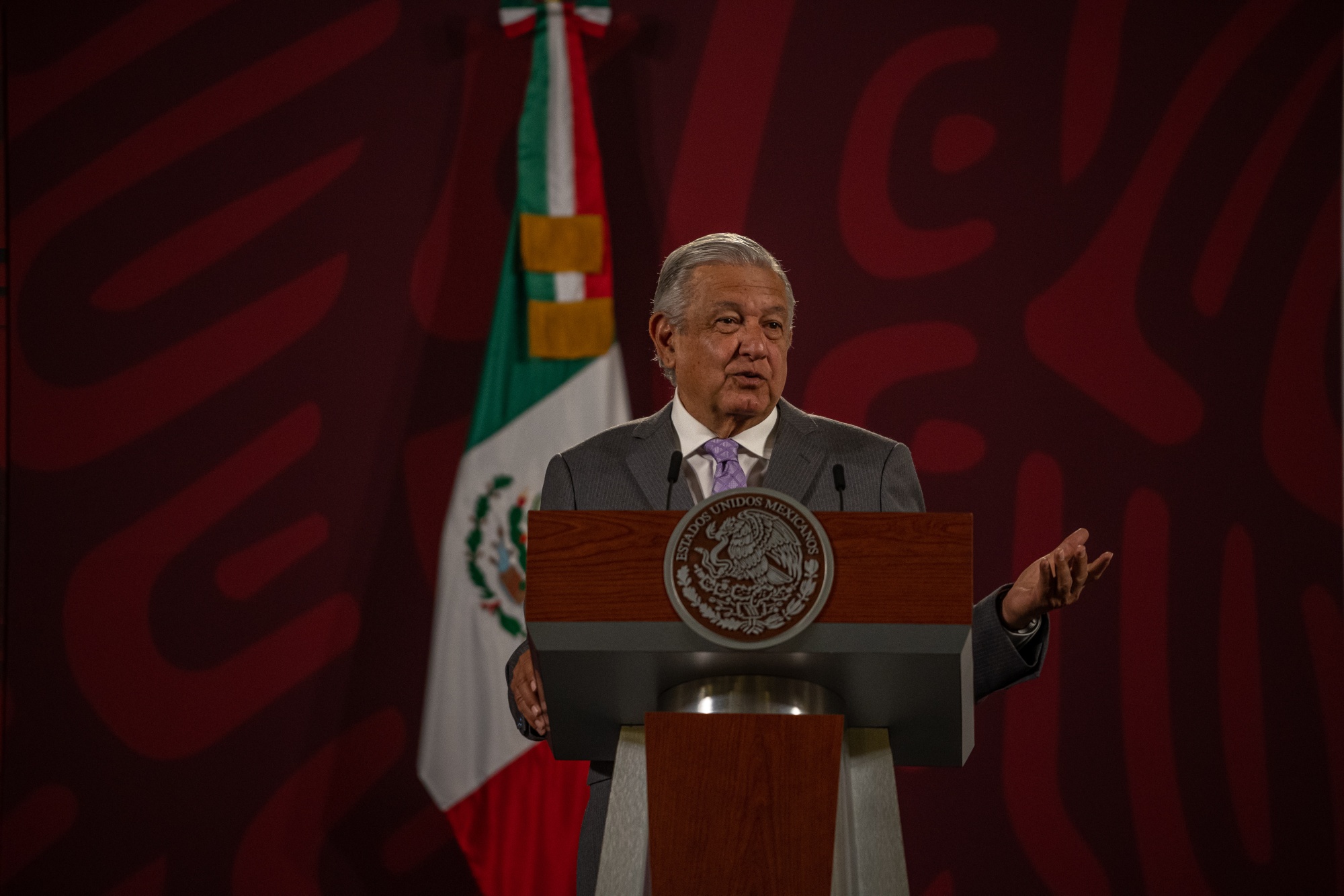 墨西哥总统安德烈斯·曼努埃尔·洛佩斯·奥夫拉多尔在2022年3月15日在墨西哥城举行新闻发布会时发表讲话。