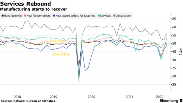 中国经济在6月份显示出进一步改善的迹象,随着新冠疫情爆发和限制逐渐放宽,服务业和建筑业出现强劲增长。官方制造业采购经理人指数显示,自2月份以来,5月份产出首次扩张。