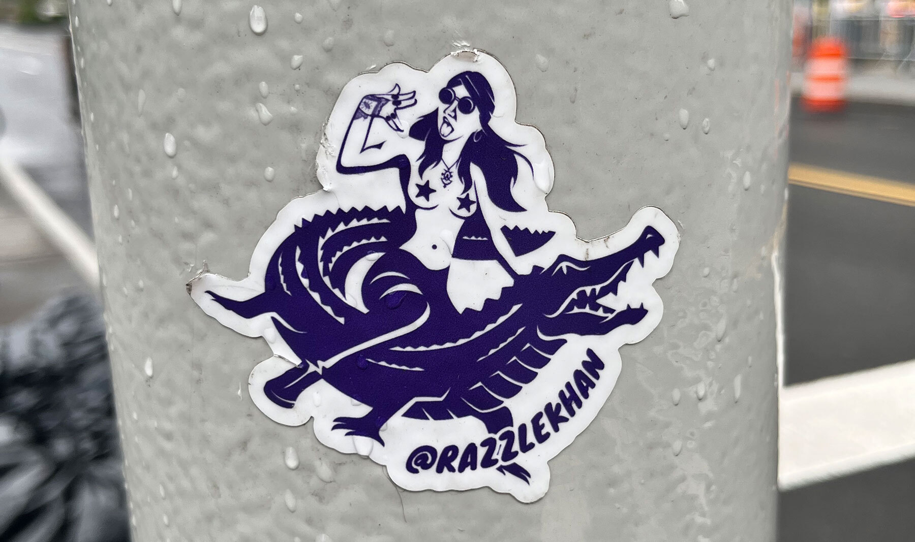 回到纽约,在曼哈顿联邦法院将犯罪嫌疑人带入的入口对面的交通灯杆上,有人贴了一张卡通贴纸,描绘了一个赤脚的Razzlekhan骑在鳄鱼上,她的舌头伸出来,手指分开成她的标志性“V”形状。看起来很新。