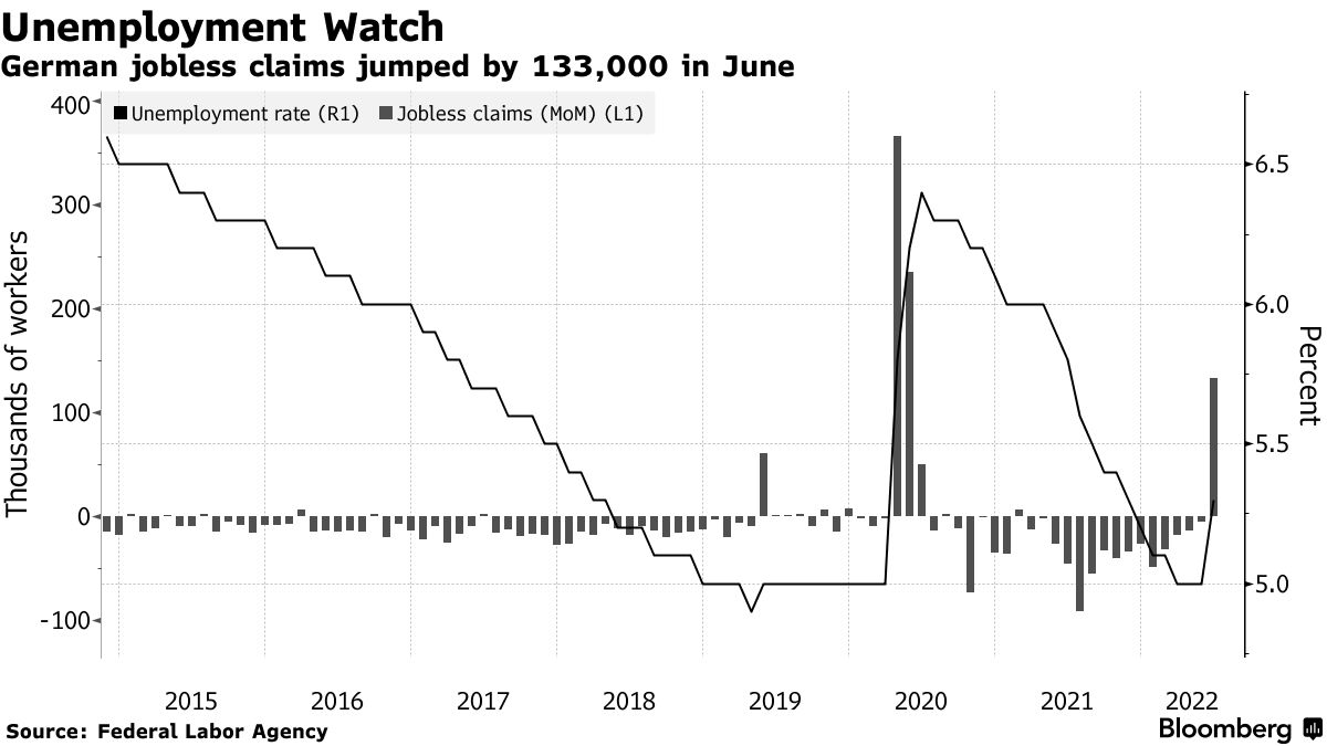 德国失业率意外上升,打破了连续15个月的下降。失业人数增加了133,000人,使失业率升至5.3%,为去年11月以来最高。经济学家估计将下降5,000人。“这些增加是因为乌克兰难民现在被记录在就业中心,并因此在劳动力市场统计数据中可见,” 联邦劳工局局长德特勒夫·舍勒说。