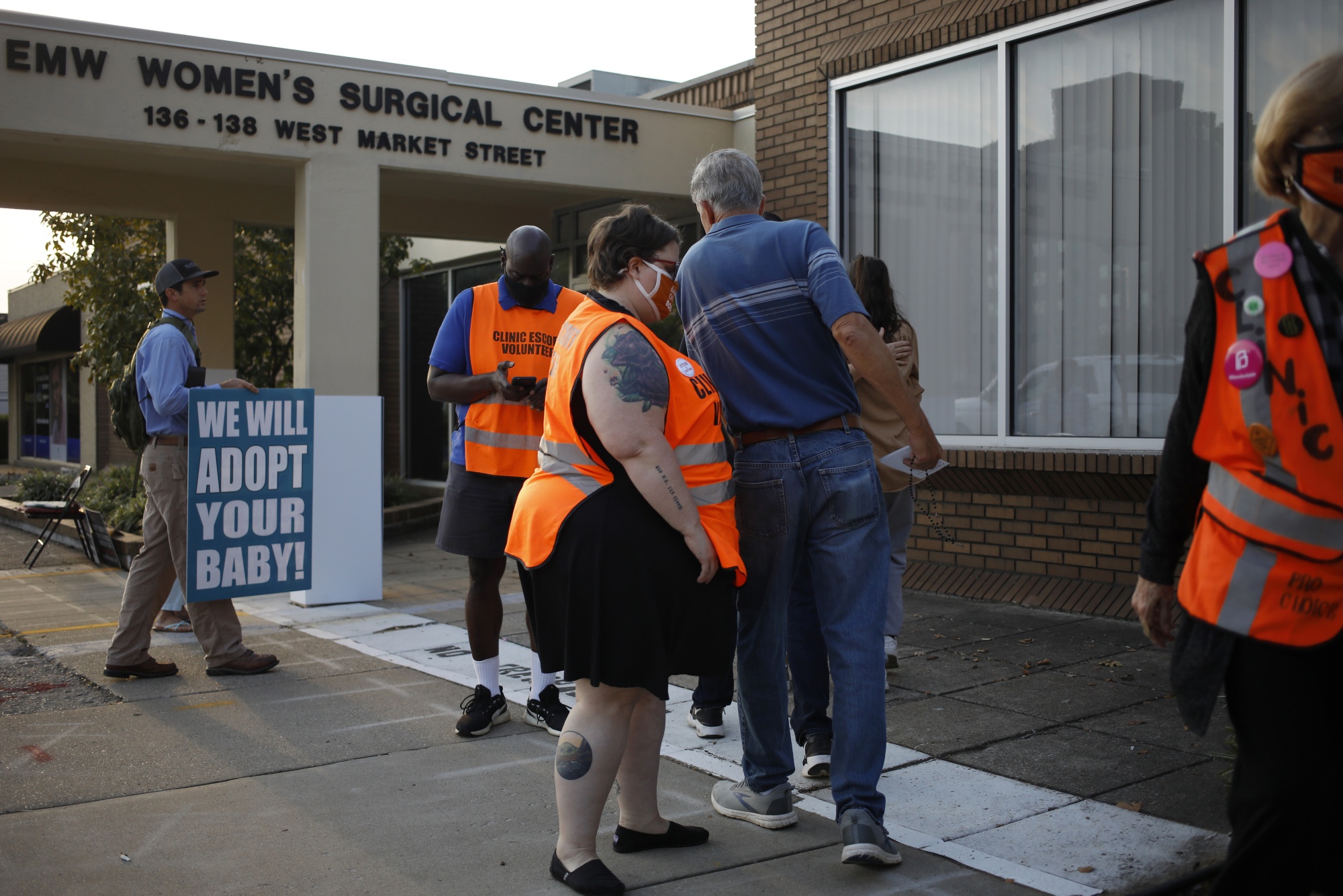 志愿诊所护送人员在2021年9月28日星期二等待路易斯维尔肯塔基州EMW妇女外科中心外的示威者。