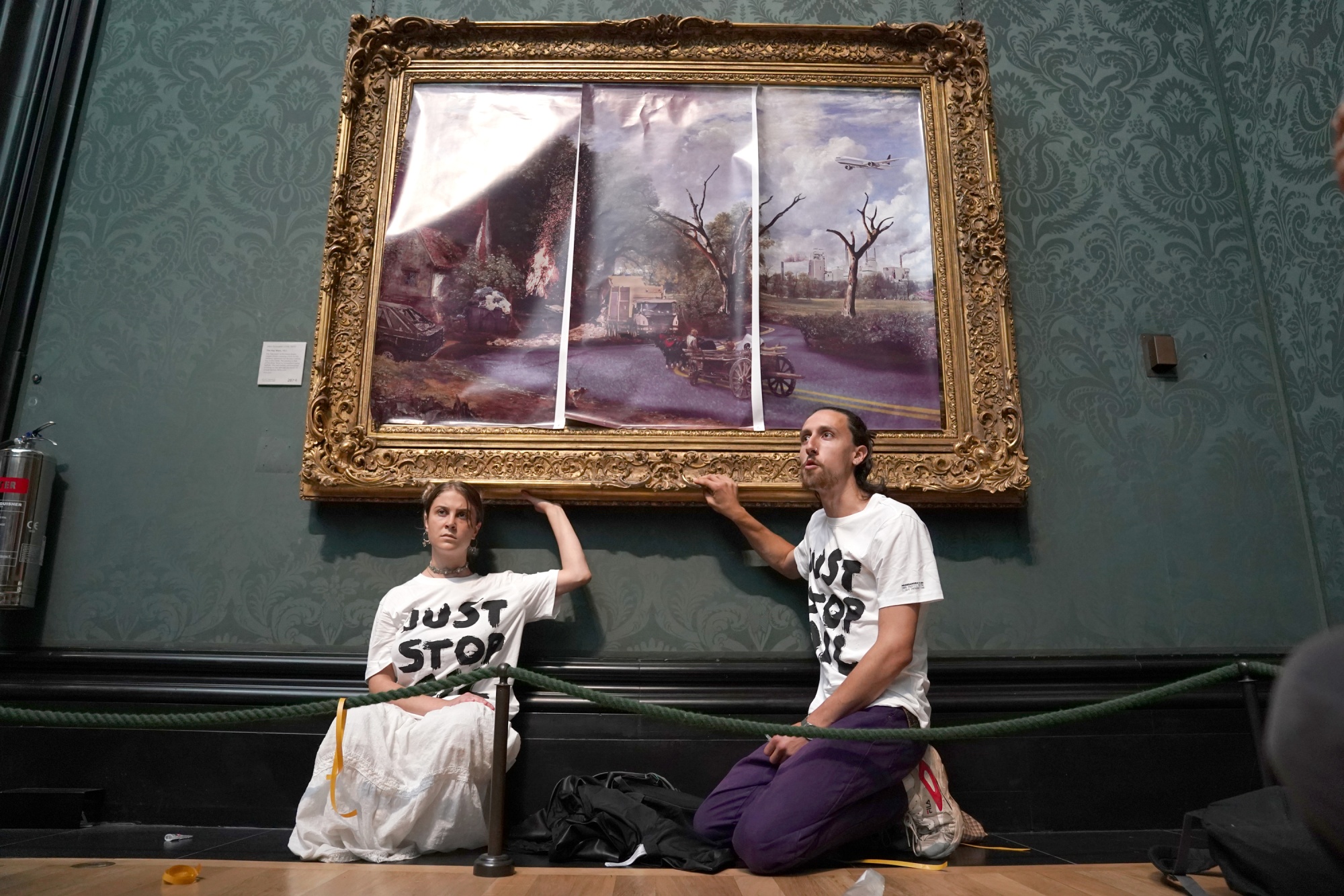 抗议者将自己的手粘在约翰·康斯特布尔的《干草车》框架上,首先在伦敦国家美术馆内用自己的图片覆盖了这幅画,时间是7月4日。