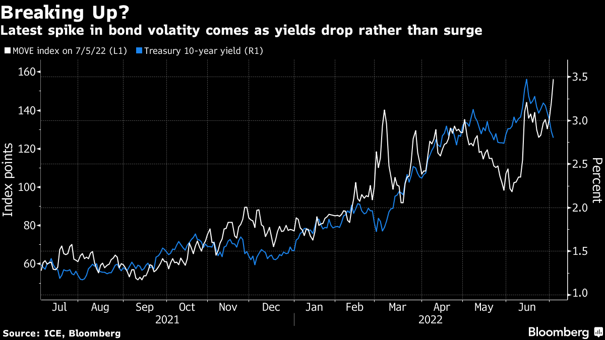 7月初,国债市场表现异常出色,波动甚至比上个月更加疯狂。隐含债券波动率指数MOVE指数飙升至自2020年3月疫情恐慌以来的最高水平,因此投资者预计短期内不会平静。为什么呢?市场开始意识到,为了缓解40年来的高通胀,经济衰退是必要的,即使经济收缩可能不足以完成这一任务。尽管本周的就业数据和下周的消费者价格指数可能给美联储带来新的压力,要求坚持实施激进的加息政策,但10年期国债收益率仍在从6月中旬的3.5%高点不断下跌。随着原油也加入商品暴跌行列,每一次加息都会被视为美联储距离新一轮降息更近一步。尽管债券波动性仍然很高,但收益率可能会继续下降。