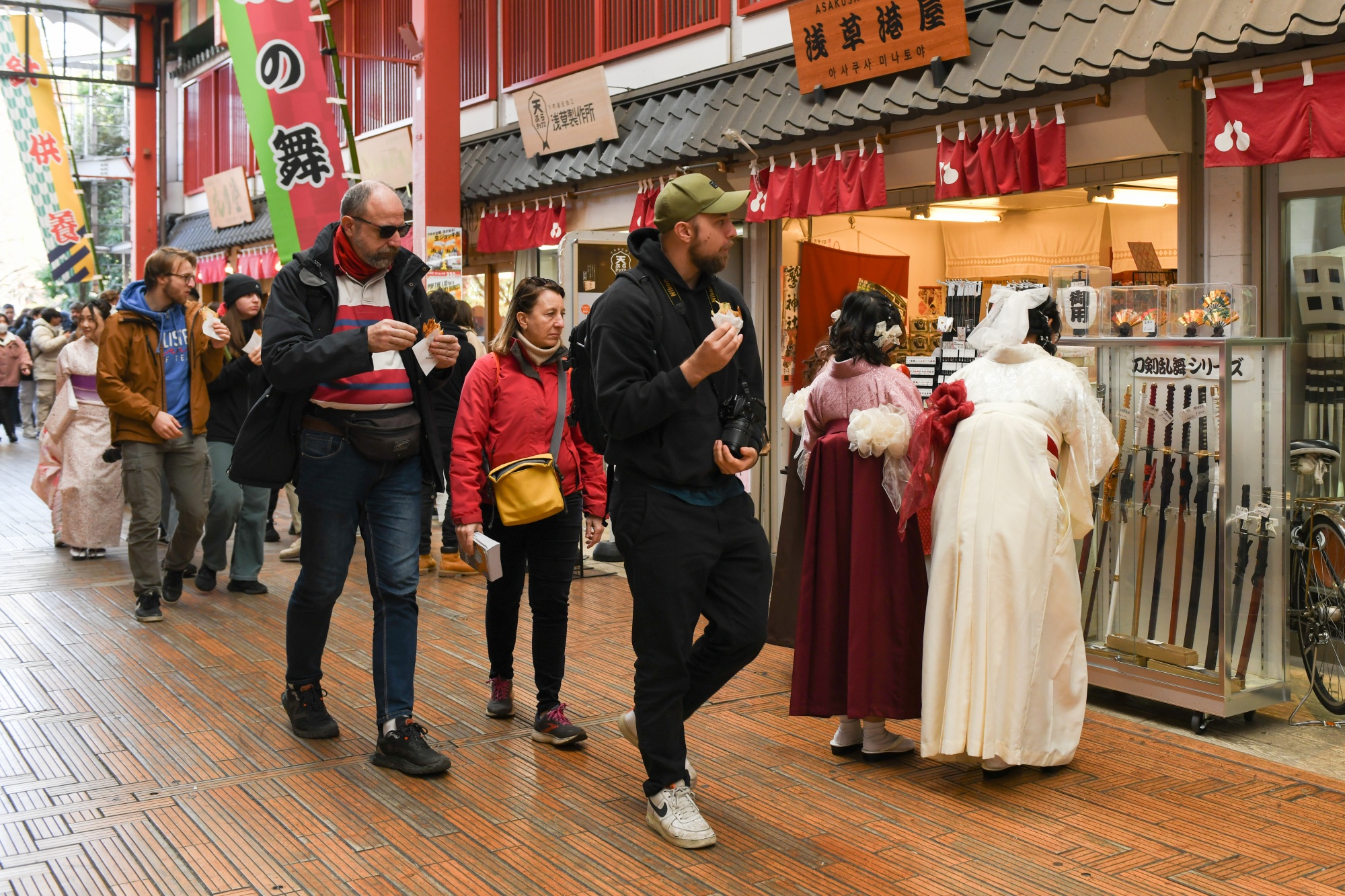 购物者在浅草的一家纪念品店前漫步。摄影师:Noriko Hayashi/Bloomberg去日本的航班变便宜了吗?