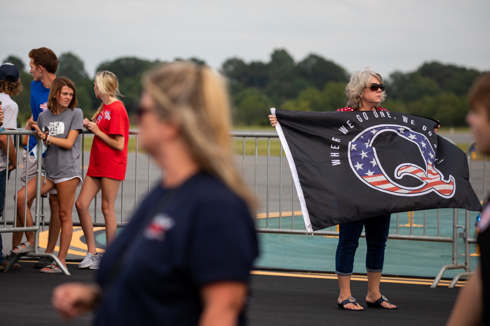 一名与会者在2020年唐纳德·特朗普在北卡罗来纳州温斯顿-塞勒姆的集会前举着一面QAnon旗帜。