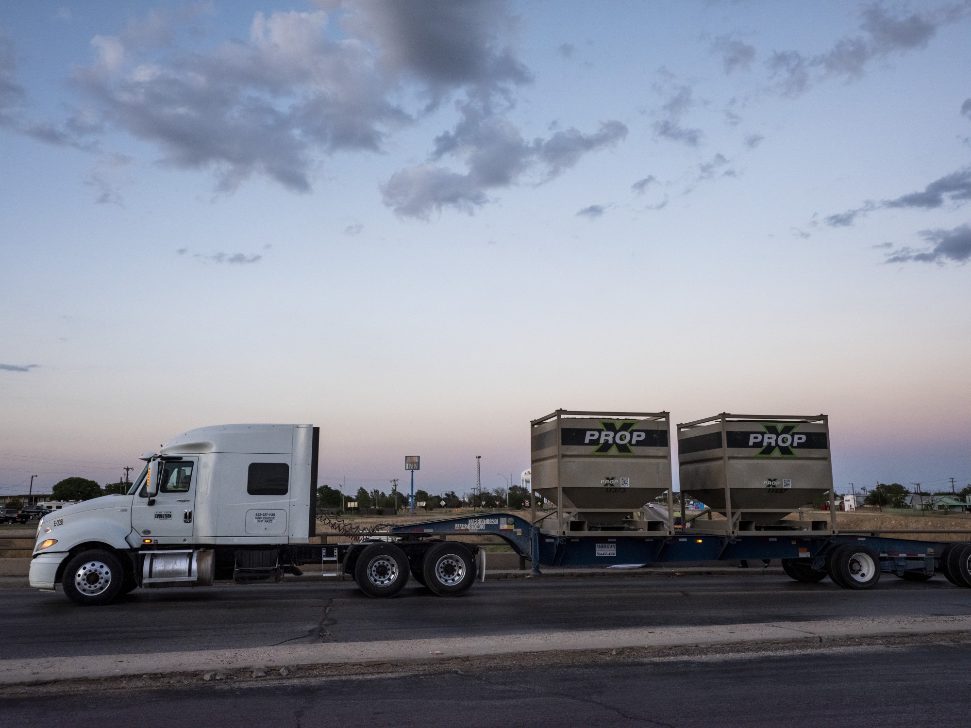 一辆运输压裂砂箱的卡车驶入大泉城的州际公路。摄影师:Matthew Busch/Bloomberg正如Brock所说:“解决了这个问题,就解决了很多问题。”