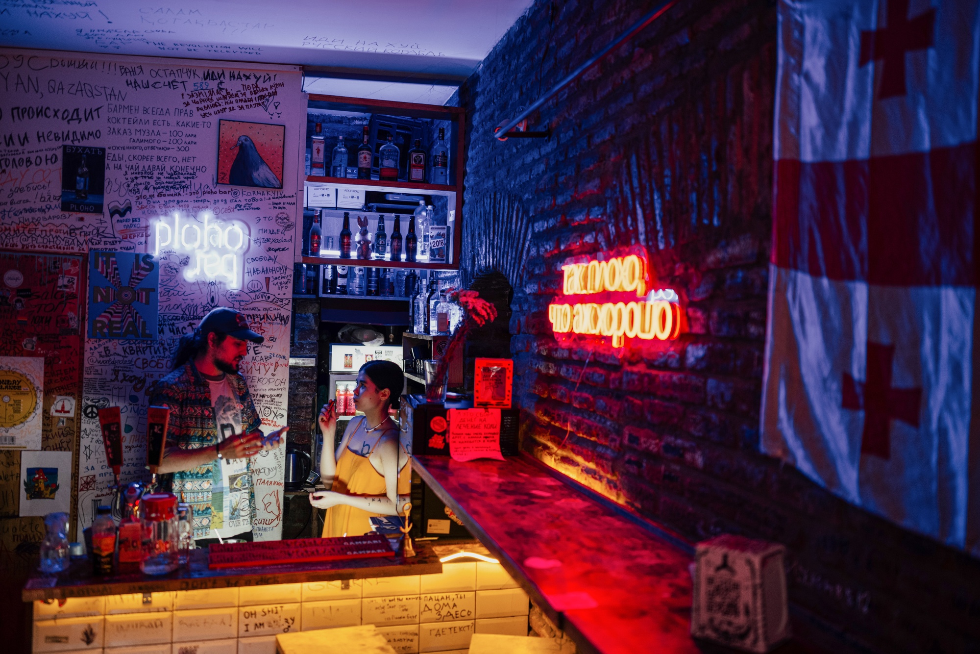 合作所有者达丽娅·热尼斯坎和第比利斯酒吧Ploho的调酒师,墙壁上装饰着反普京涂鸦。摄影师:塔科·罗巴基泽/彭博社米德济扬斯基找到了通往第比利斯周围出现的几家讲俄语的酒吧之一的路。来自哈萨克斯坦的24岁合作所有者达丽娅·热尼斯坎说:“在这里卖酒甚至不需要许可证。” 这家小酒吧于10月开业,墙壁和天花板上布满了反普京的涂鸦。