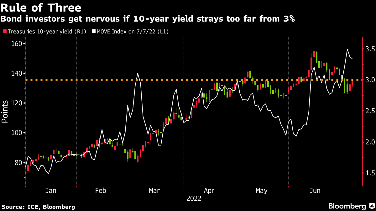 随着投资者等待关键数据点的澄清,国债波动不定 — 周五稍后的工资数据,然后是下周的CPI — 关于美联储本月将会有多强硬。此外,经济是否足够强大以应对预期的利率上涨速度和幅度。美国债券的实现和隐含波动性也飙升,但这里的模式使人觉得,当谈到基准10年期收益率时,3%现在是黄金平均数。ICE的MOVE指数预期价格波动,通常被称为债券的恐惧指标,已经在收益率超过那个整数时跳动,该指数也在5月底触底,当时收益率远低于3%。波动性可能会继续上升,直到明显地看出3%是收益率长期上限还是下限。