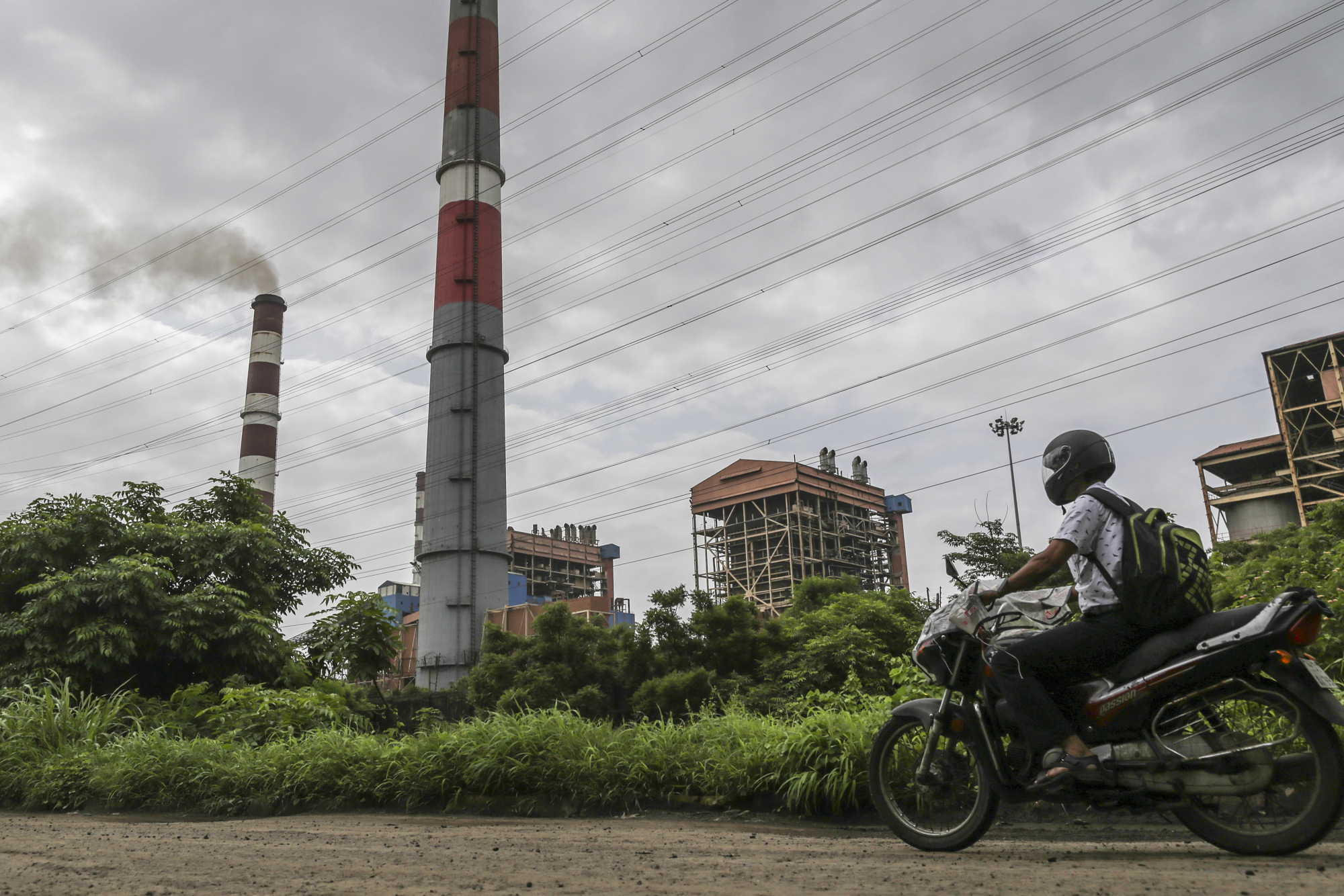 一名摩托车手驶过孟买塔塔电力公司特龙贝热电站。