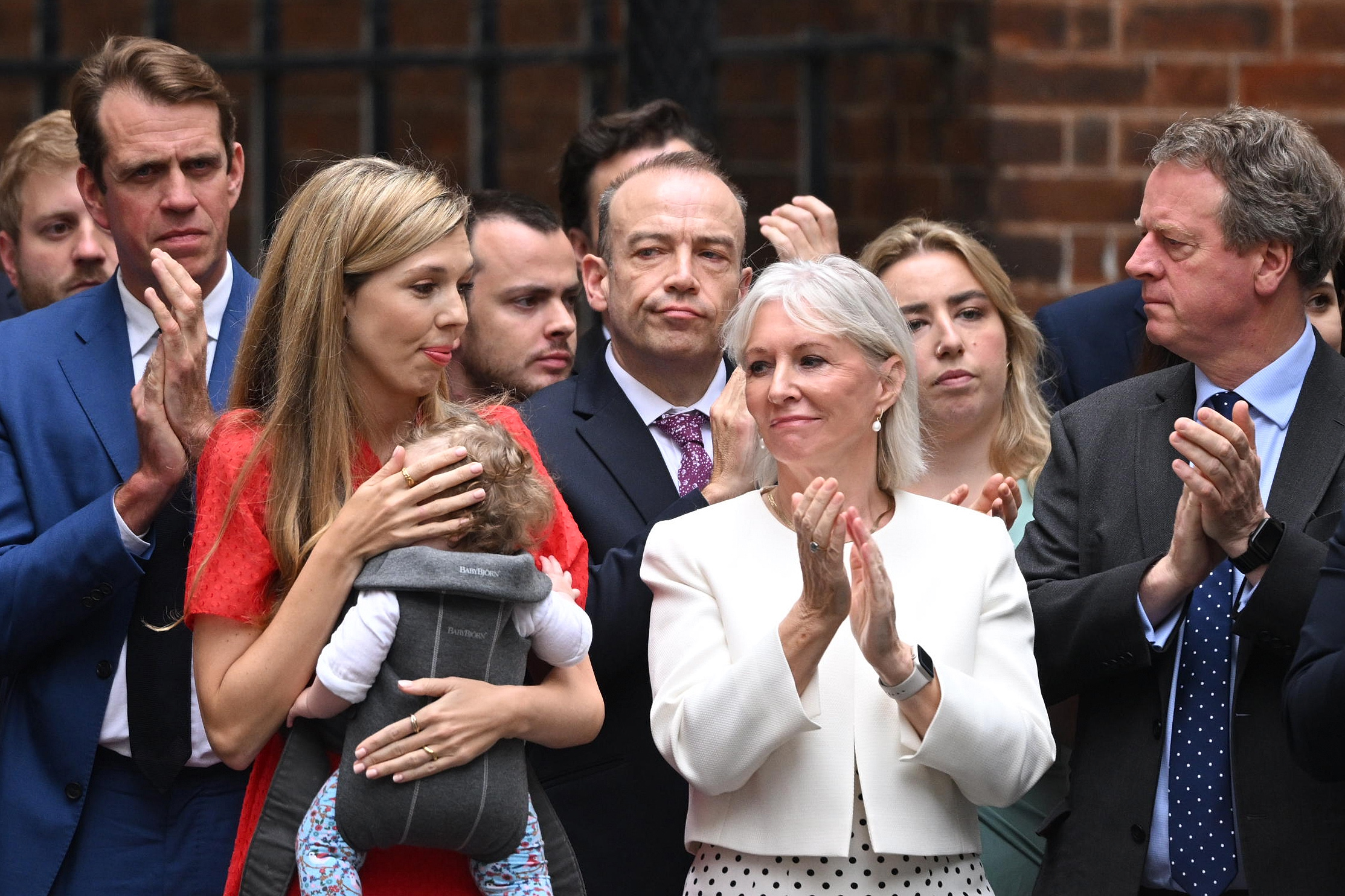 纳丁·多里斯(Nadine Dorries)站在凯丽·约翰逊(Carrie Johnson)和她的女儿罗米(Romy)旁边,于7月7日在唐宁街10号外。摄影师:Leon Neal/Getty Images Europe“会有很多人感到宽慰,也许还有一些人会感到失望,”他对英国人民说,当他几个小时后在10号楼的台阶上宣布他的决定时。“我想让你们知道,我很难过要放弃这个世界上最好的工作。”