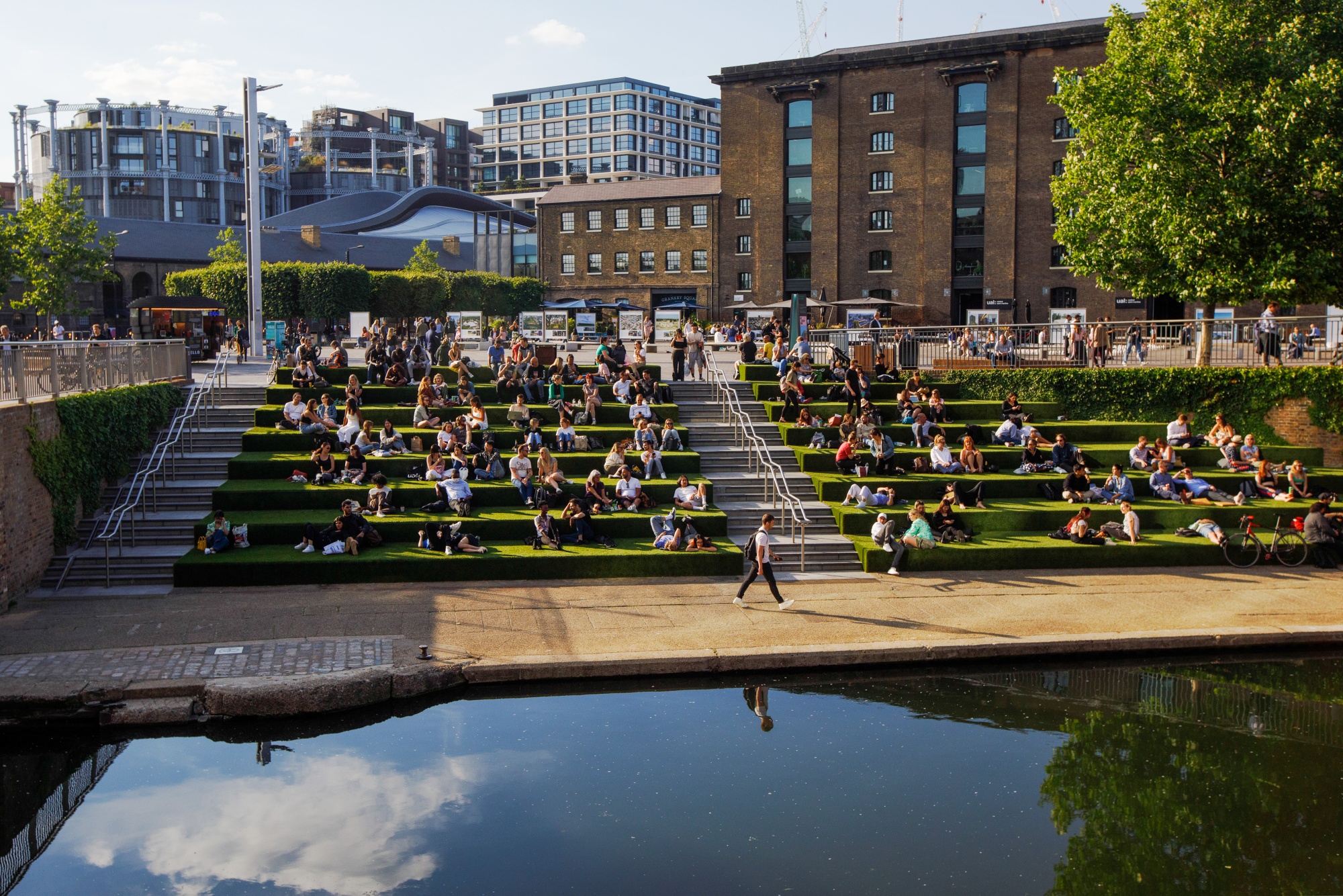 人们坐在伦敦运河旁的露台上,靠近谷仓广场和伦敦艺术大学中央圣马丁学院校园。