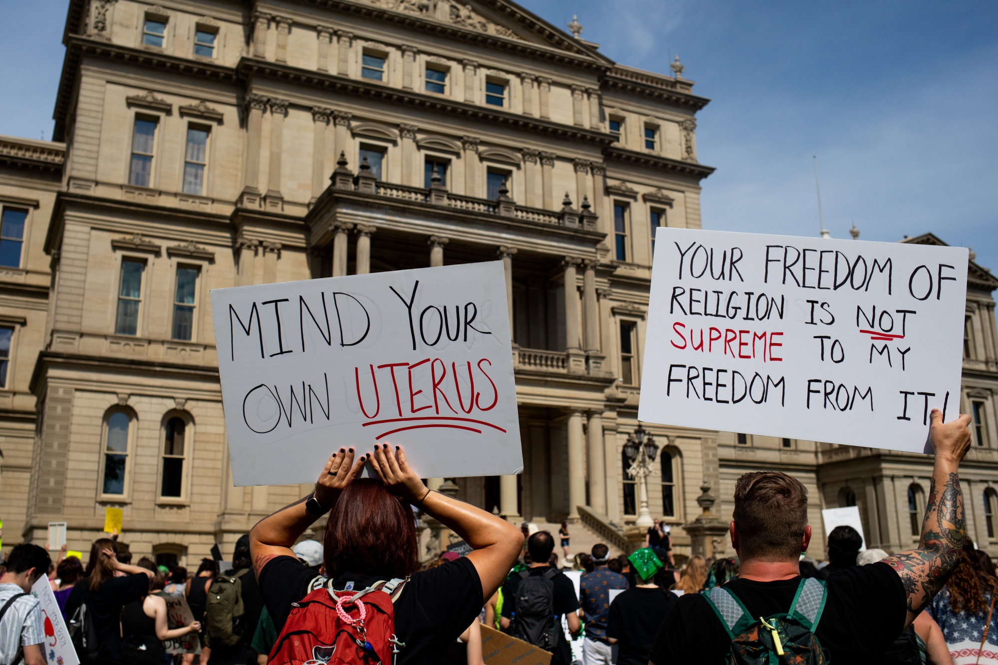 堕胎权利示威者在2022年7月4日星期一在美国密歇根州兰辛举行的全国抗议活动中。