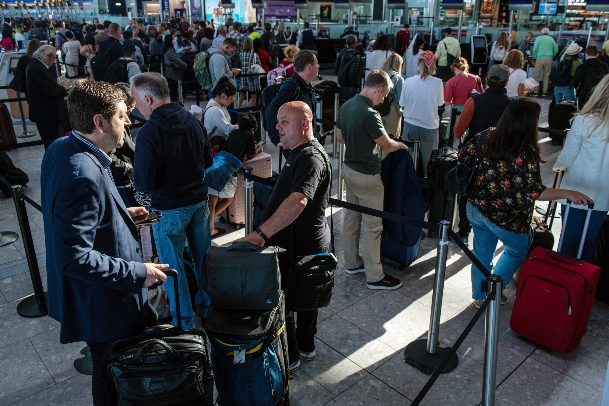 乘客在伦敦希思罗机场5号航站楼的出发大厅排队办理登机手续,摄于6月13日。摄影师:Chris J. Ratcliffe/Bloomberg投资者和公司表示,中东战争对收入构成重大风险,抵制活动抑制销售,红海航运混乱威胁到它们的供应链。