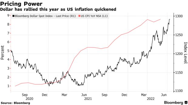 如果今天公布的美国通胀数据显示进一步加剧,策略师表示美元还有上涨空间。根据彭博调查中的中位数预测,6月CPI可能比去年同期增长8.8%,这是自1981年以来的最大涨幅,这将使美联储在利率上面临压力。通胀部分是由汽油成本推动的,这给拜登在11月中期选举之前带来了压力。