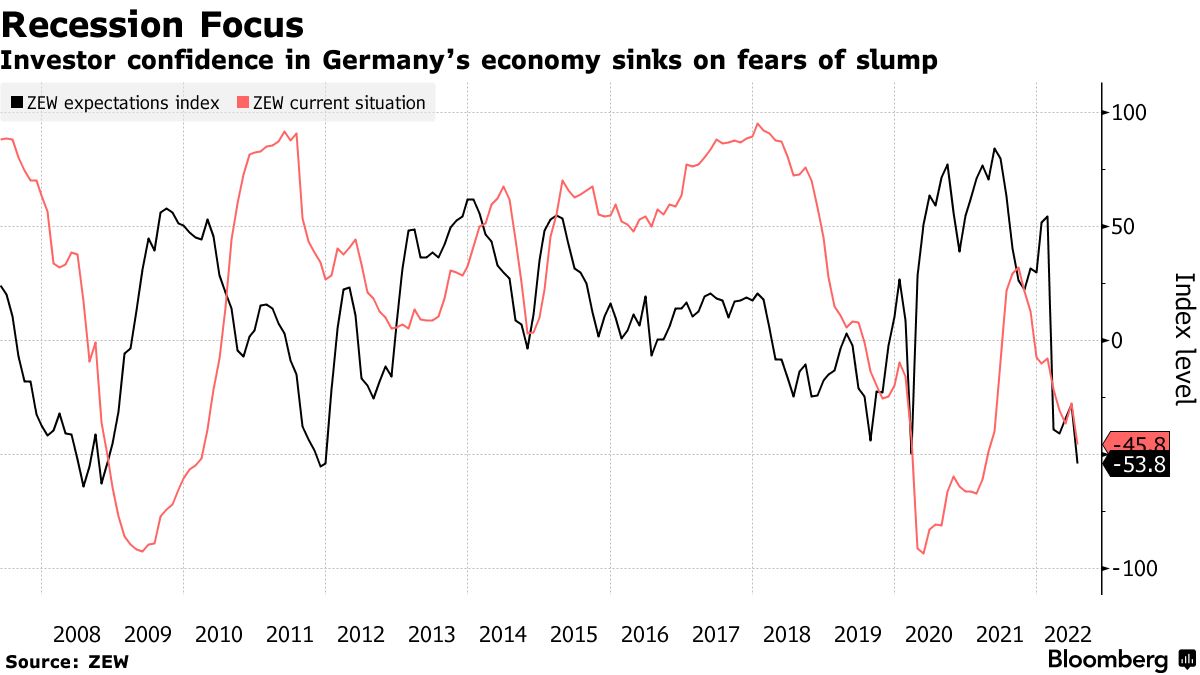 对德国经济的投资者信心跌至2011年以来的最低点,因为该国的衰退变得越来越可能,并且存在被切断俄罗斯天然气供应的风险。 ZEW预期指数下跌幅度超过经济学家的预测,甚至比已经陷入困境的水平更为严重。欧洲央行遏制创纪录的通货膨胀和中国的疫情限制也在压制情绪。